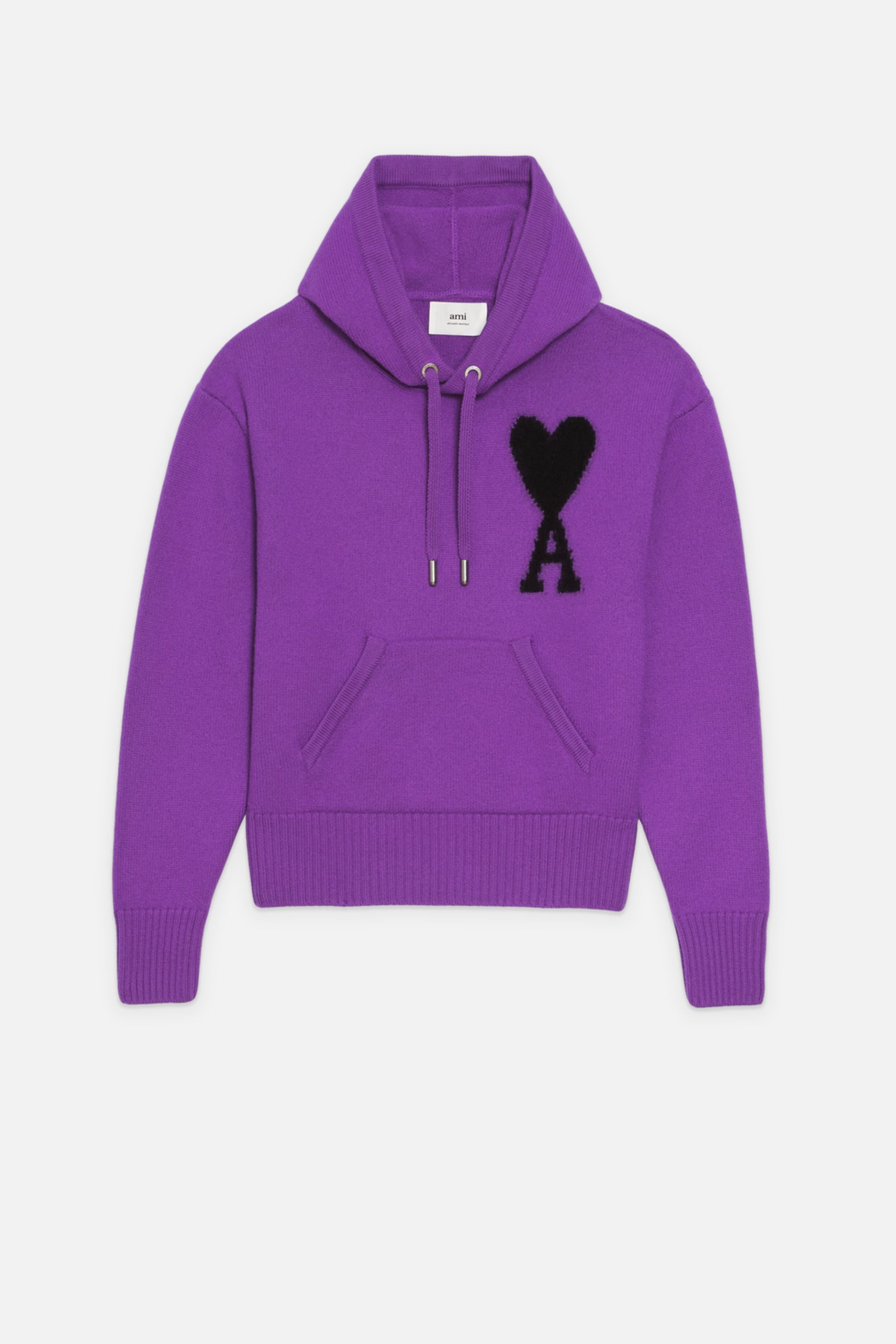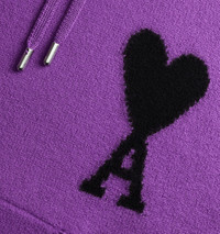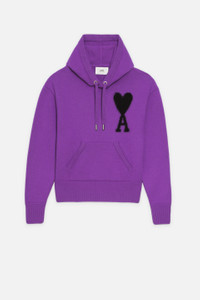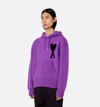 Product Description logo-intarsia knit hoodie from AMI Paris featuring purple, virgin wool, signature Ami de Coeur monogram motif, intarsia-knit logo, drawstring hood, front pouch pocket, long sleeves, straight hem and ribbed trim. Hoodie in felted merino wool. - Unisex product - Oversized fit - Jersey stitch - Black intarsia knitted Ami de Cœur - 62 cm center back length (size M) - 56 cm center back length (size XS) - Hood with adjustable drawstring - Nickel color metal ends and eyelets - RWS certified product REF UKS802.018501 Size & Fit This style is unisex and it's design to be worn oversize. For man, take your normal size. For woman, take one size down than your usual size. Materials & Care Instructions Hand wash low temperature Do not bleach Do not tumble dry Hang dry after removing excess water Cool iron Dry clean possible