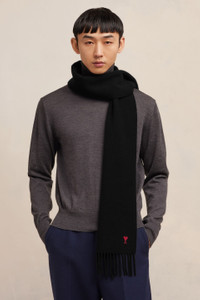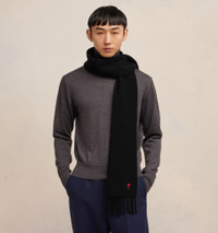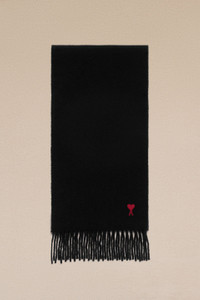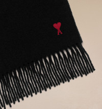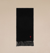 Product Description Ami de Coeur fringed-edge wool scarf from AMI Paris featuring core black, signature Ami de Coeur monogram motif, fringed edge, wraparound style and wool. Fringed classic scarf in wool. - Red Ami de Cœur patch - Size without the fringes: 25x190 cm - Length of the fringes: 10 cm each side - Made in Italy (with love) REF USF405.334001 Size & Fit One size. Materials & Care Instructions 100% Wool Do not wash Chlorine prohibited Do not tumble dry Cool iron Dry clean petroleum solvent only on a gentle process Find out more about product traceability.