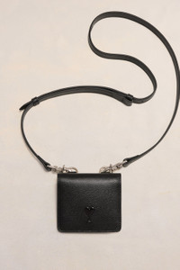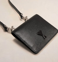 Product Description strap leather cardholder from AMI Paris featuring black, leather, textured finish, logo plaque, bi-fold design, snap-fit fastening, single shoulder strap and card slots. Card holder with strap in grained leather. - Cotton canvas lining - Tonal Ami de Coeur rivet in metal and resin - Adjustable and removable leather strap - Six card compartments and one coin pocket - Snap buttons fastenings - Vibrated silver metal hardware - Size: 9.5x8.5 cm - Made in Morocco (with love) REF USL101.AL0036001 Size & Fit One size. Materials & Care Instructions 100% Cow Leather