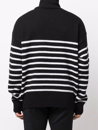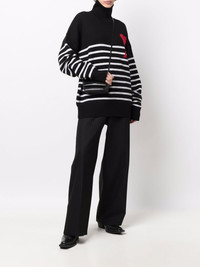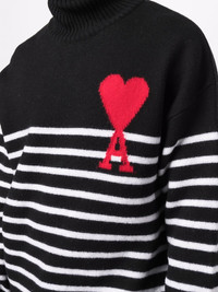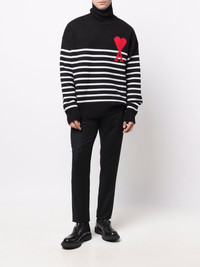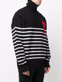 Product Description Black/white virgin wool Ami de Coeur striped roll-neck jumper from AMI Paris featuring roll neck, knitted construction, signature Ami de Coeur monogram motif, drop shoulder, long sleeves, ribbed cuffs, ribbed hem and breton stripes. When buying this unisex item, keep in mind that it is graded in standard men's sizing.. Sweater in felted merino wool. - Oversize fit - Jersey stitch - Red intarsia-knitted Ami de Coeur - 67 cm back length (size M) 100% Virgin Wool Rws REF H21K229.018004 Size & Fit This item is designed to be worn lose. Take your normal size. Model wears size S. Chest: 81cm/31.8” Hip: 86cm/33.8” Waist: 58cm/22.8” Shoe: 39 UE Height: 1.76m /5'7" Materials & Care Instructions Hand wash low temperature, Do not bleach, Do not tumble dry, Dry flat, Cool iron, Dry clean possible
