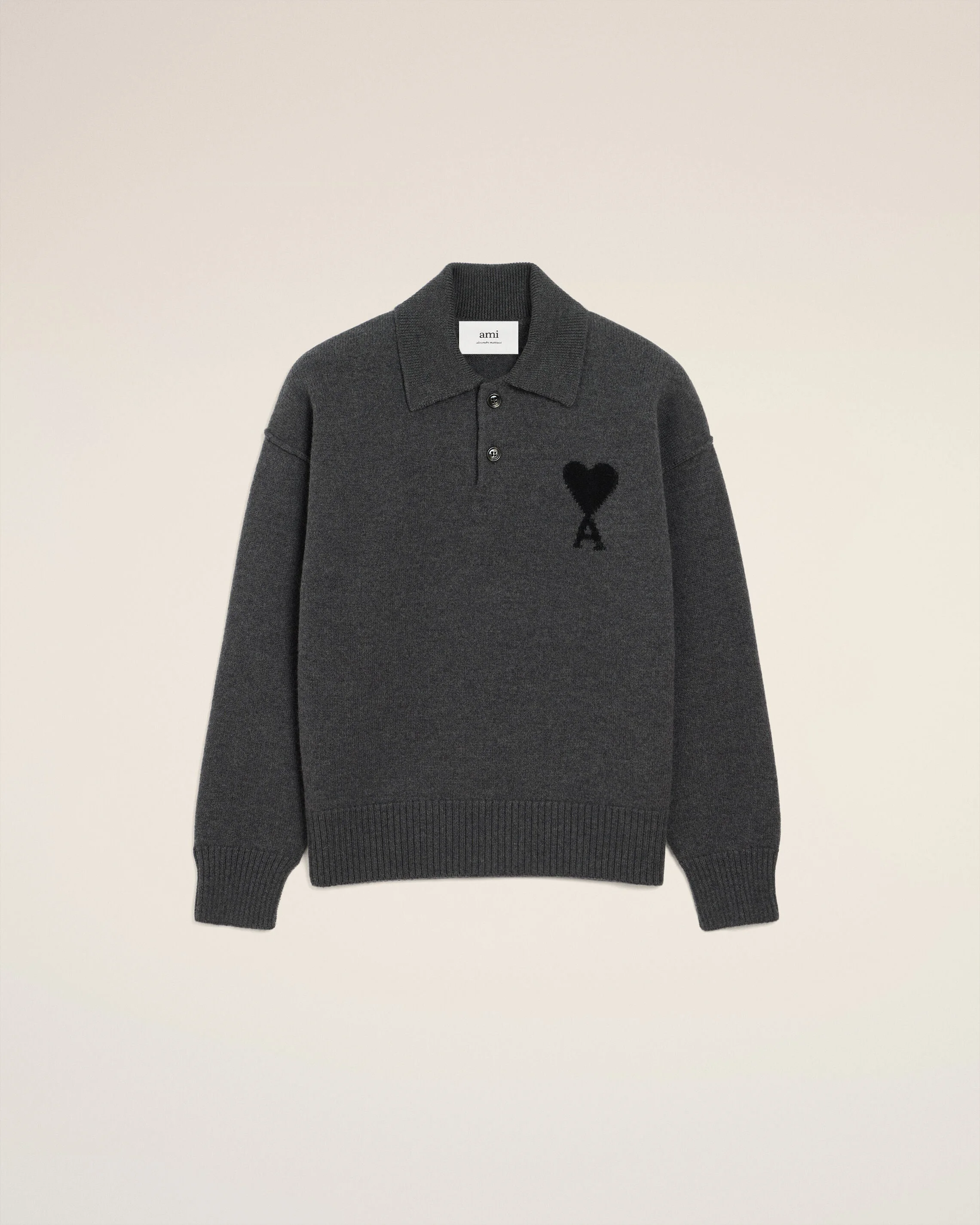 Polo in felted merino wool knit. Unisex product Manches longues "ami" engraved horn buttons Intarsia knitted Ami de Coeur on the chest Inside out seams Jersey stitch 65 cm center back length (size M) 61 cm center back length (size XS) Made in Portugal (with love) REF: UPL409.018.0504 SIZE & FIT This style is unisex. For man, take your normal size. For woman, take one size down than your usual size. Man model is 186 cm / 6"1 and is wearing a size M. Woman model is 175 cm / 5"8 and is wearing a size XS. COMPOSITION & CARE GUIDE Main Material : 100% Wool Hand wash low temperature Chlorine prohibited Do not tumble dry Dry flat Cool iron Dry clean possible Contains non-textile parts of animal origin