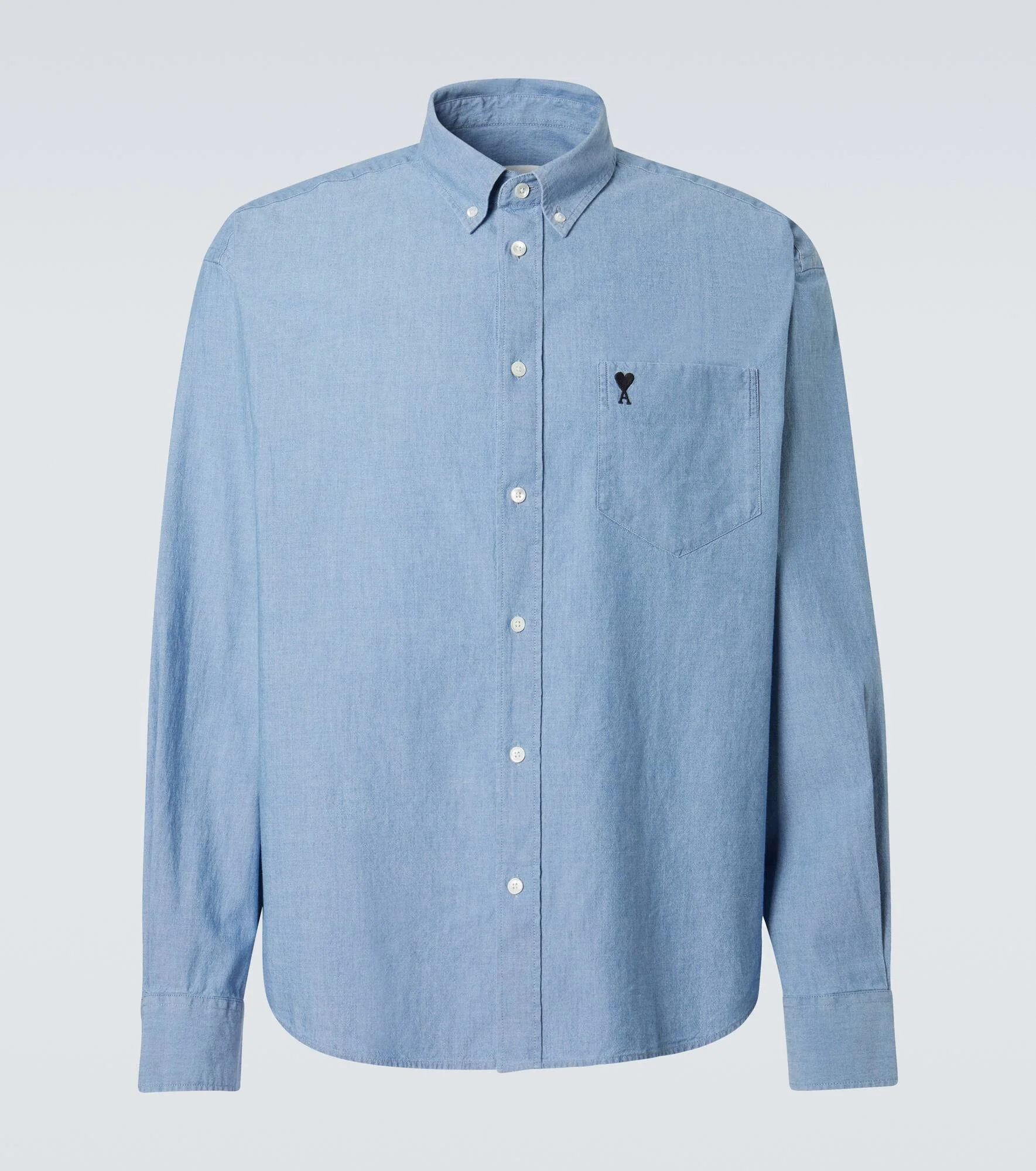 A symbol of Ami Paris since 2016, the Ami de Cœur logo is named after the French expression for "friend of the heart". The motif is embroidered on this long-sleeved shirt, made from soft cotton chambray. Product Details - Material: 100% cotton - Care instructions: machine wash at 30 degrees - Made in Portugal - Color: blue - Designer color name: Bleu Cachemire - Contains non-textile parts of animal origin - Collar: button-down - Cuff: buttoned - Pockets: breast pocket - Closure: buttoned front - Item number: P01105014 Size & Fit - True to size - Without pleats in the back - Designed for a loose fit - Non-stretchy fabric - Falls below the hip - The model in the picture is 185cm-6'1" and wearing a size EU 41