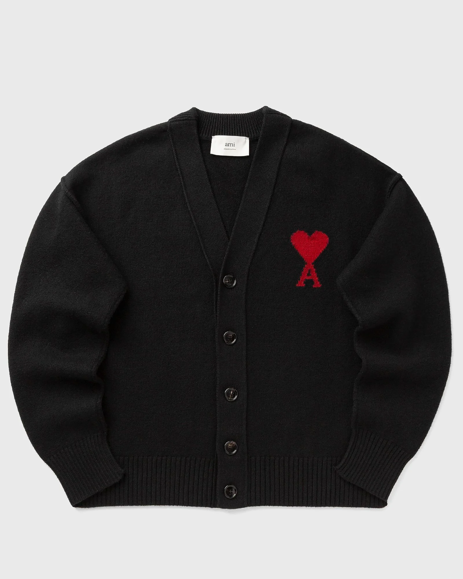 The Ami de Coeur Cardigan adds stylish accents with its subtle Ami de Coeur monogram on high-quality wool—made in Italy for a luxurious feel and premium quality. The classic V-neck silhouette with full-length button placket, ribbed hem and cuffs, and straight hem offers clean minimalism paired with comfortable wear. - V-neck - Button placket - Ribbed hem and cuffs - Ami de Coeur monogram Article number: UKC367.018-009 Gender: men Color: NOIR/ROUGE Material: 100% Wool