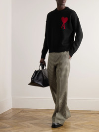 This sweater is intarsia-knitted with the playful AMI PARIS emblem, composed of a heart floating on acapital 'A'. It's made from soft virgin wool, certified by the Responsible Wool Standard – the accreditation can give you confidence that the yarn comes from farms that value animal welfare and responsibly managed land. Layer a T-shirt underneath and wear yours with jeans or casual tailoring. Size & Fit - Fits true to size. Take your normal size - Designed for a relaxed fit - Dropped shoulder seam - Weighted knit - S/M/L sizing Details & Care - Black and red virgin wool - 100% virgin wool - Hand wash