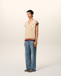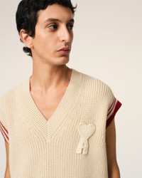 BEIGE WOOL RIBBED SLEEVELESS V NECK SWEATER