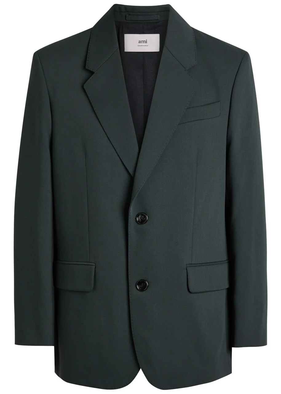Info & Care AMI Paris wool blazer Notched lapels, padded shoulders, button-fastening cuffs, chest slit pocket, two flap pockets, back vents, three internal pockets, fully lined; Button fastenings at front 100% wool; lining: 50% cotton, 50% polyester; sleeve lining: 54% acetate, 25% viscose, 1% polyester Dry clean Size & Fit Length shoulder to hem: 31 inches/ 78.5cm Midweight Loose fit Model is 6'1"/ 185cm, chest size 38.5 inches and wears a size;IT48