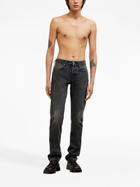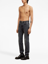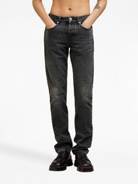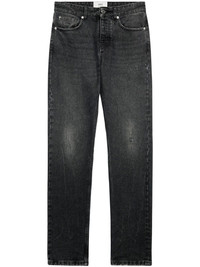 logo-patch straight-leg jeans AMI Paris' logo highlights these black straight-leg jeans from the brand's AW23 collection - appearing on the back, in light brown. This model is crafted from cotton and features a mid-washed effect and ripped details throughout. Highlights - Black - Cotton - Logo patch to the rear - Mid-rise - Belt loops - Front button fastening - Classic five pockets - Straight leg Imported Composition Cotton 100%