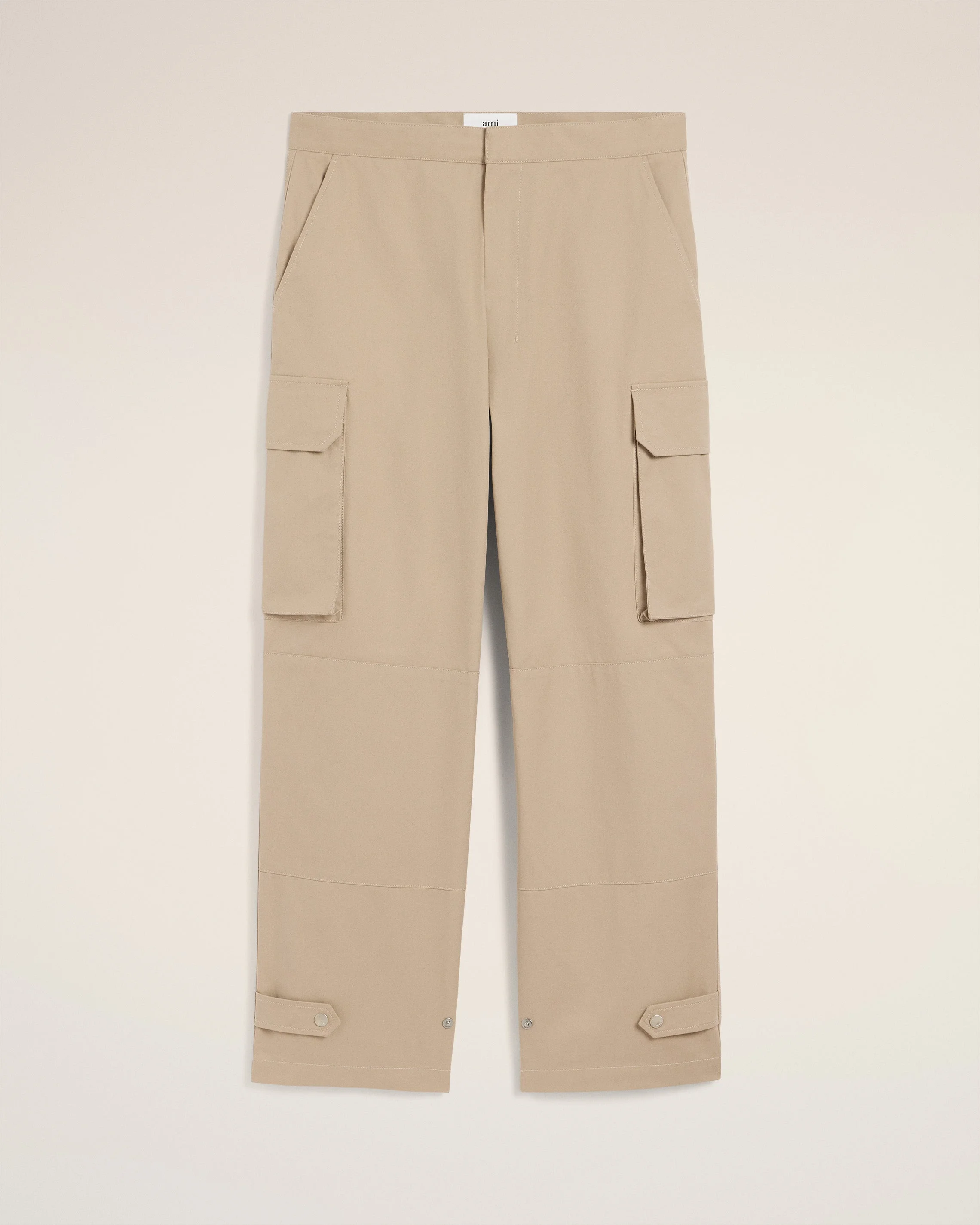 Cargo trousers in cotton gabardine. Classic waist Large leg Zipped fly Pockets with invisible snap buttons "ami alexandre mattiussi" leather label on the back Adjustable bottom legs with snap buttons Adjustable back tabs with snap buttons 27 cm bottom leg width (size M) Made in Portugal (with love) REF: HTR828.CO0132.229 SIZE & FIT Fits true to size. Take your normal size. Model is 186 cm / 6"1 and is wearing a size M. COMPOSITION & CARE GUIDE Main Material : 100% Cotton Machine wash at 30°c gentle Chlorine prohibited Do not tumble dry Cool iron Dry clean possible Contains non-textile parts of animal origin