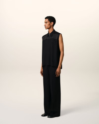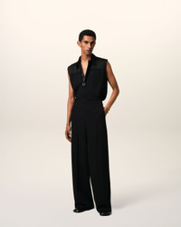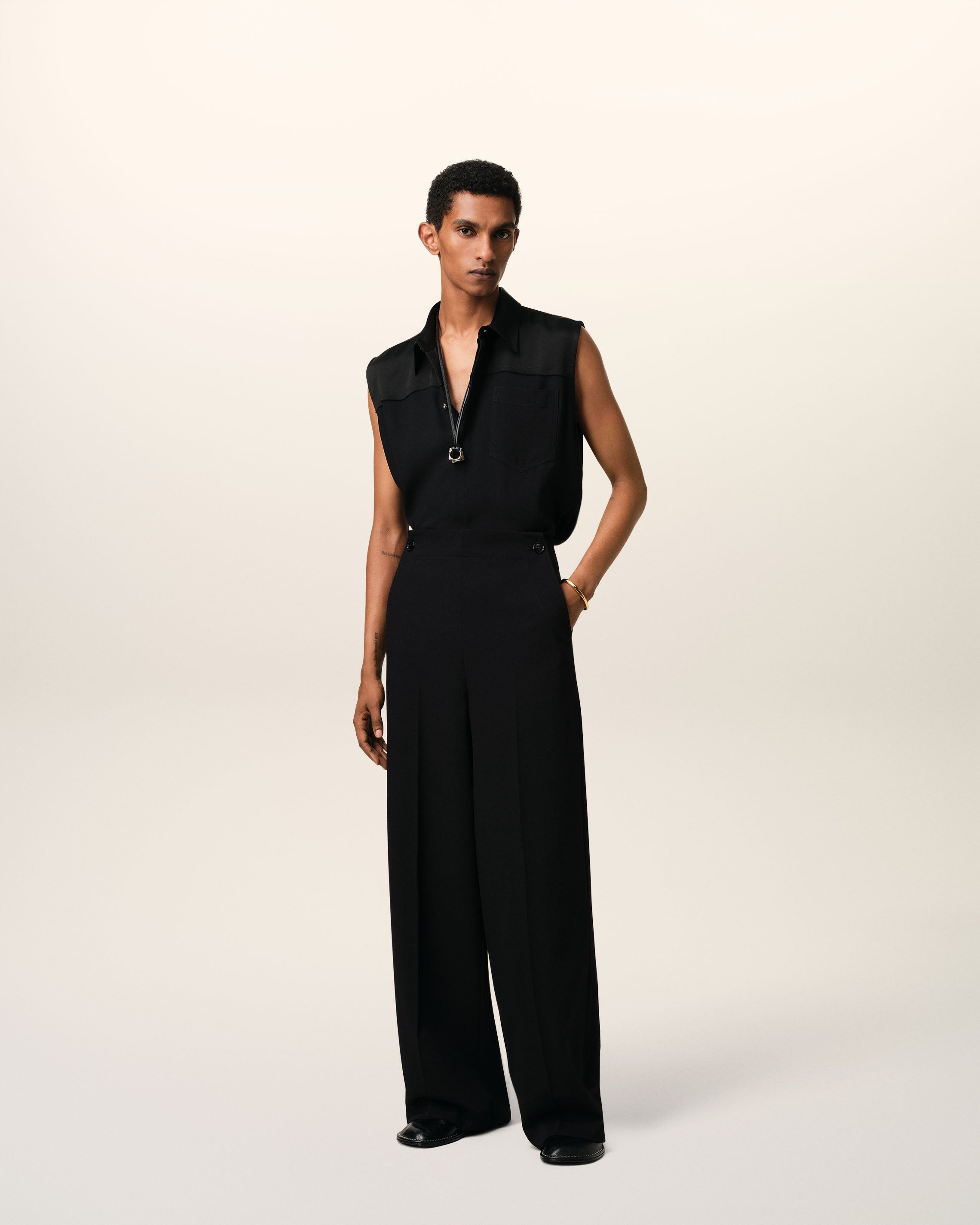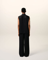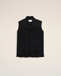 Sleeveless shirt with contrasted top in viscose and acetate crepe with satin back. Classic fit 74 cm center back length (taille 40) Contrast with the shine of the fabric Mini Ami de Coeur engraved metal plate under collar Classic collar Chest patch pocket Hidden tab and cuffs buttoned Metal buttons Made in Portugal (with love) REF: HSH220.AC0014.001 SIZE & FIT Fits true to size. Take your normal size. Model is 1m87 / 6'2" and is wearing a size 40. COMPOSITION & CARE GUIDE 71% Acetate, 29% Viscose Chlorine prohibited Do not tumble dry Dry clean gentle Cool iron Do not wash