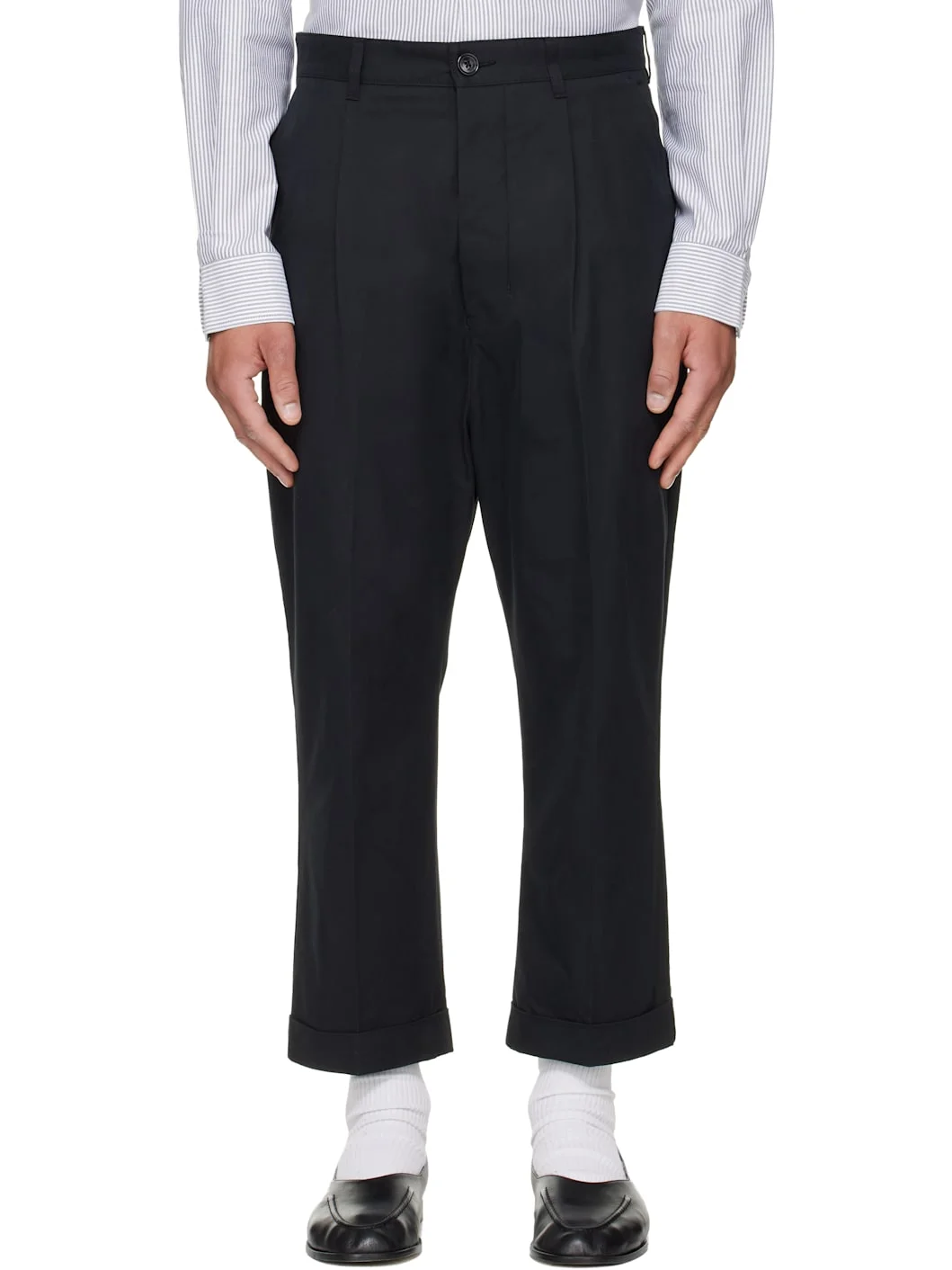 Cotton gabardine trousers. · Loose-fit, tapered · Belt loops · Four-pocket styling · Button fly · Pleats at front · Creased legs · Rolled cuffs · Jacron logo patch at back waistband · Horn hardware Supplier color: Black 100% cotton. Made in Portugal 261482M191006