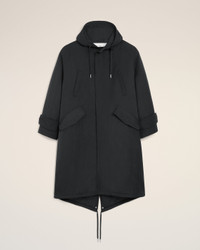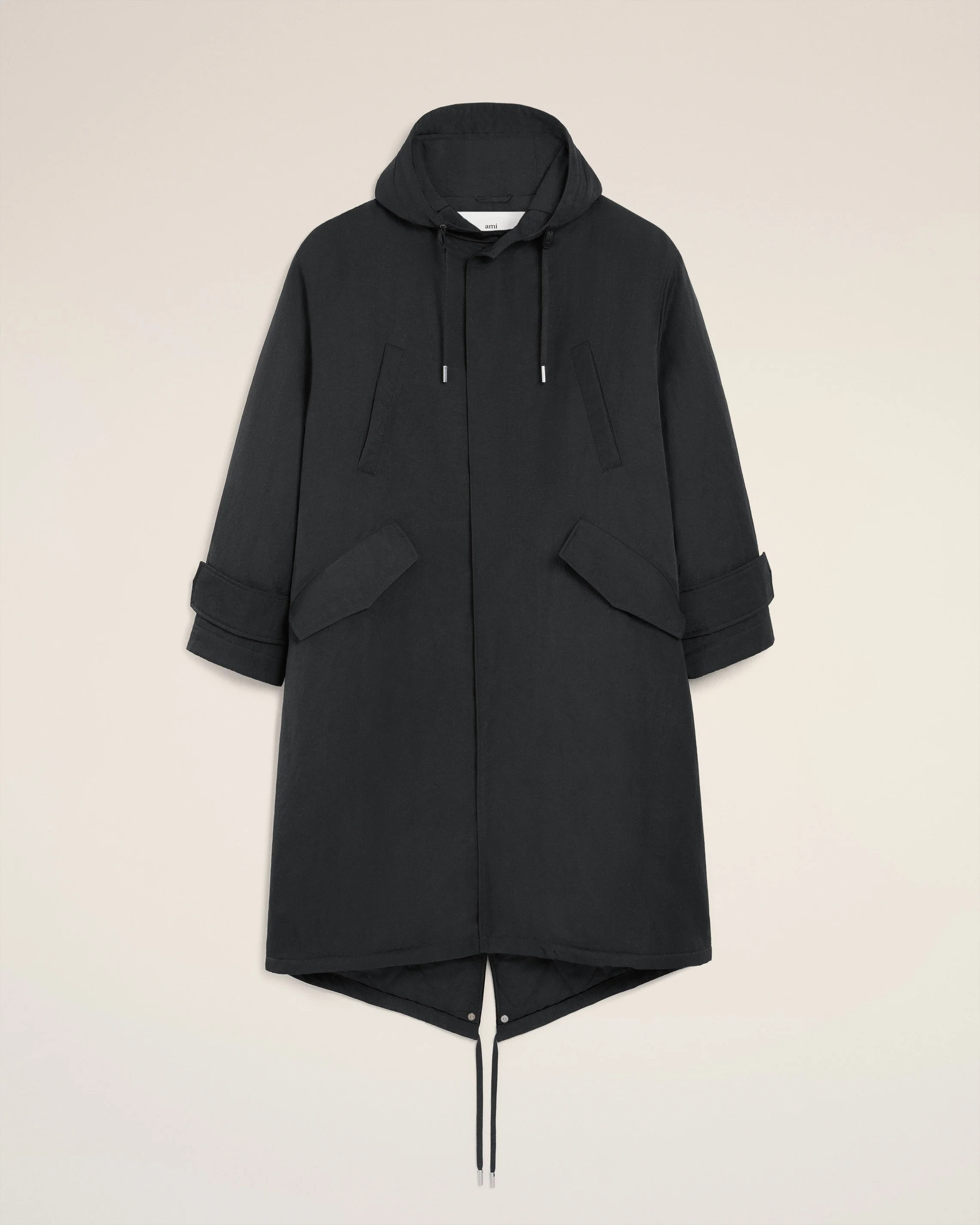 Padded parka jacket in crinkled nylon serge. Nickel double metal zipper with "ami" engraved puller and leather detail Front closing and adjustable cuffs with invisible snap buttons and leather details Front and intern pocket with invisible snap buttons Fully lined and padded Drawstring at the hood, waist and body bottom with metal eyelets and leather details "ami" leather label sewn in the side seam Water repellent fabric 131 cm center back length (size M) Made in Romania (with love) REF: HJK823.PA0035.020 SIZE & FIT This item is designed to be worn lose. Take your normal size. Model is 185 cm / 6"1 and is wearing a size M. COMPOSITION & CARE GUIDE Main Material : 100% Polyamide Padding : 100% Polyethylene Main Lining : 100% Polyester Pocket Lining : 100% Cotton Do not wash Chlorine prohibited Do not tumble dry Cool iron Dry clean gentle