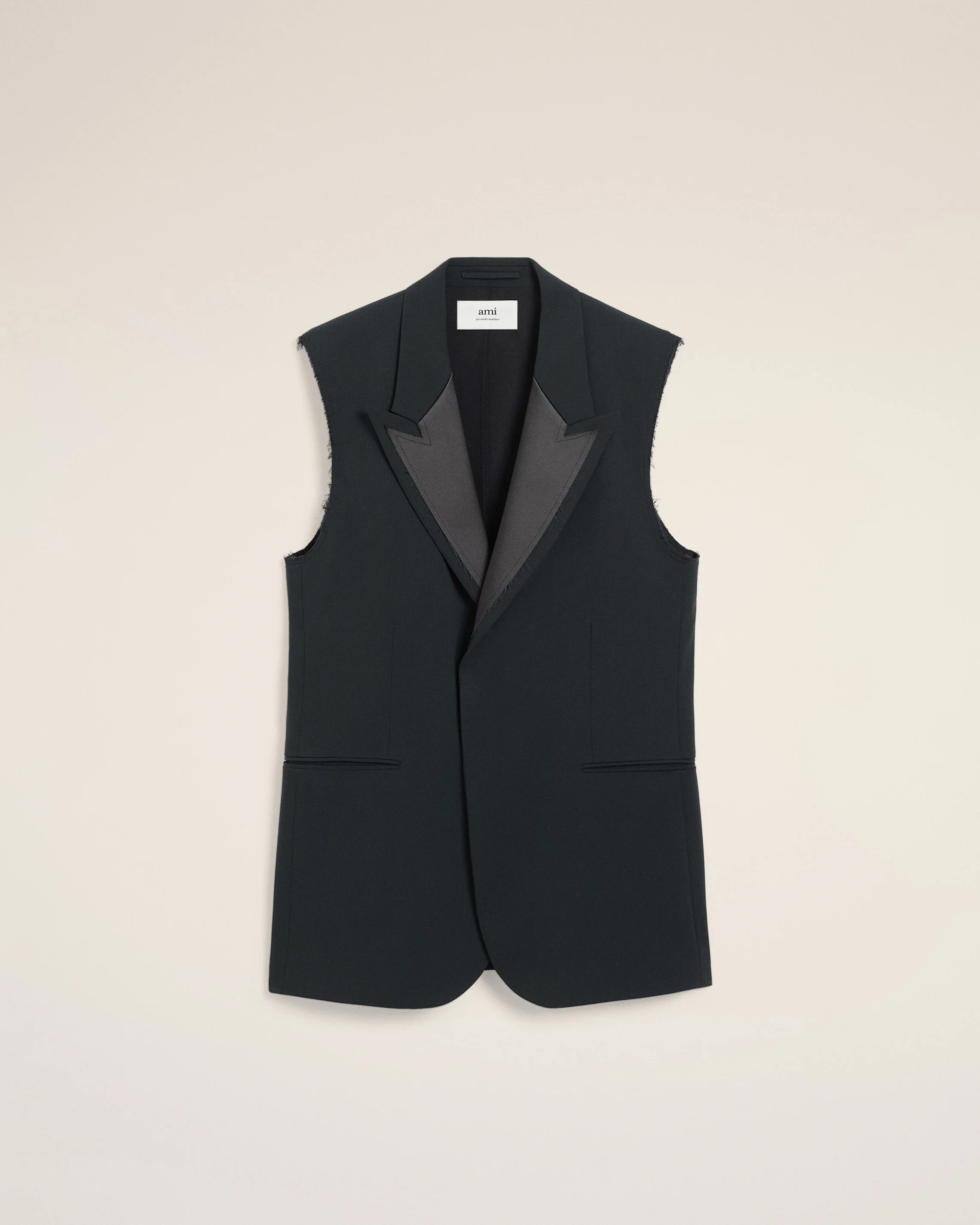 Sleeveless smoking jacket in light wool tricotine. Boxy fit Notched collar Horn buttons 2 buttons single breasted 2 double piped pockets 2 inside pockets Side back slits Fully lined Collar lapel with raw edge cut, featuring the application of a second layer in satin also cut with raw edges 84 cm center back length (size 40) Made in Portugal (with love) REF: HBV003.WV0067.020 SIZE & FIT This item is designed to be worn lose. Take your normal size. Model is 185 cm / 6"1 and is wearing a size 48. COMPOSITION & CARE GUIDE Main Material : 100% New Wool Secondary Material : 95% Polyester 5% Elastane Body Lining : 50% Polyester 50% Cotton Pocket Lining : 100% Cotton Do not wash Chlorine prohibited Do not tumble dry Medium iron Dry clean petroleum solvent only on a gentle process