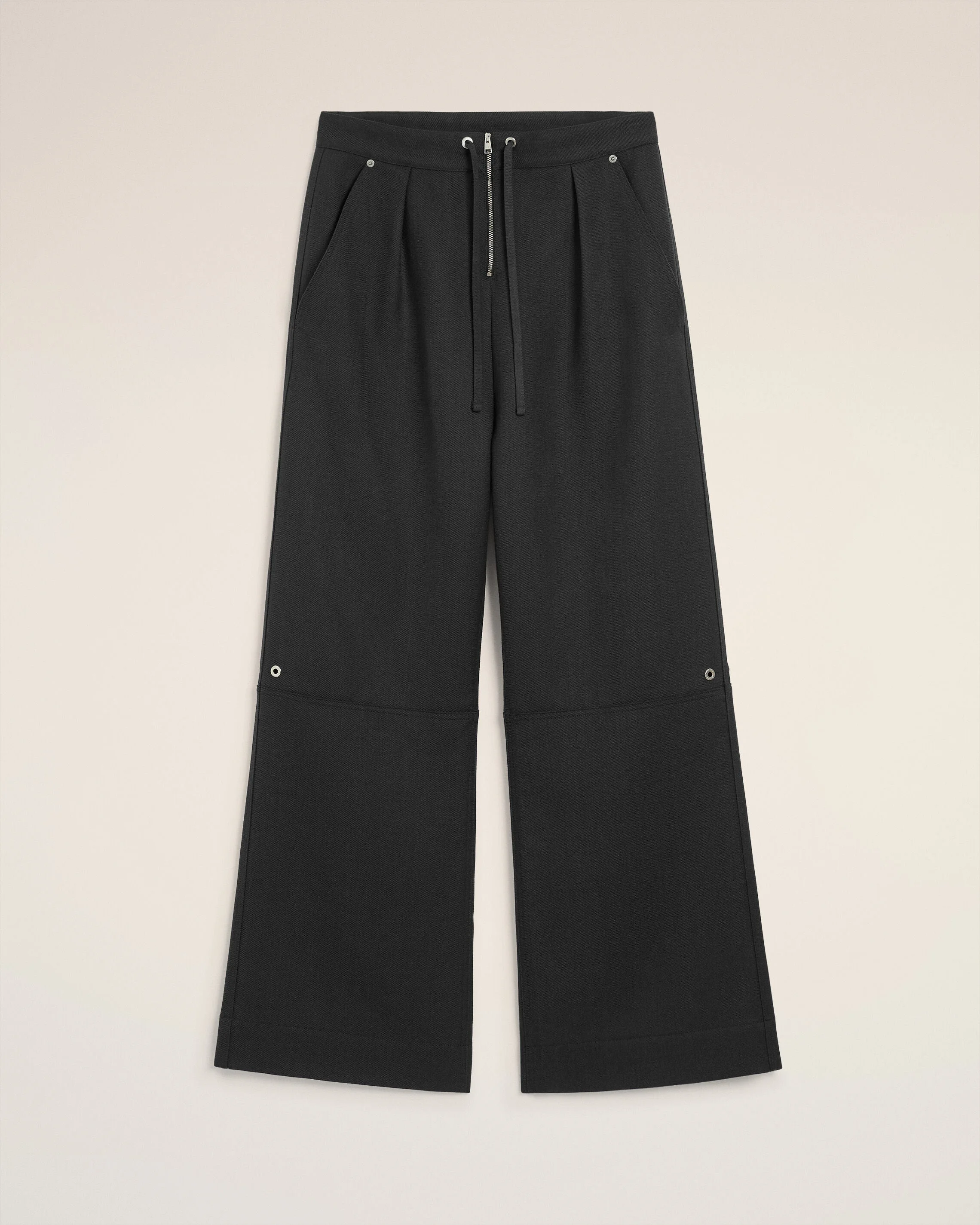Zipped trousers in wool gabardine. Wide fit Visible zipped fly Pockets with invisible snap buttons "ami alexandre mattiussi" leather label on the back Drawstrings at the belt Details with metal eyelets and studs 33 cm bottom leg width (size M) Made in Portugal (with love) REF: HTR832.WV0088.020 SIZE & FIT This item is designed to be worn lose. Take your normal size. Model is 187 cm / 6"2 and is wearing a size M. COMPOSITION & CARE GUIDE Main Material : 100% New Wool Pocket Lining : 65% Polyester 35% Cotton Do not wash Chlorine prohibited Do not tumble dry Cool iron Dry clean gentle Contains non-textile parts of animal origin