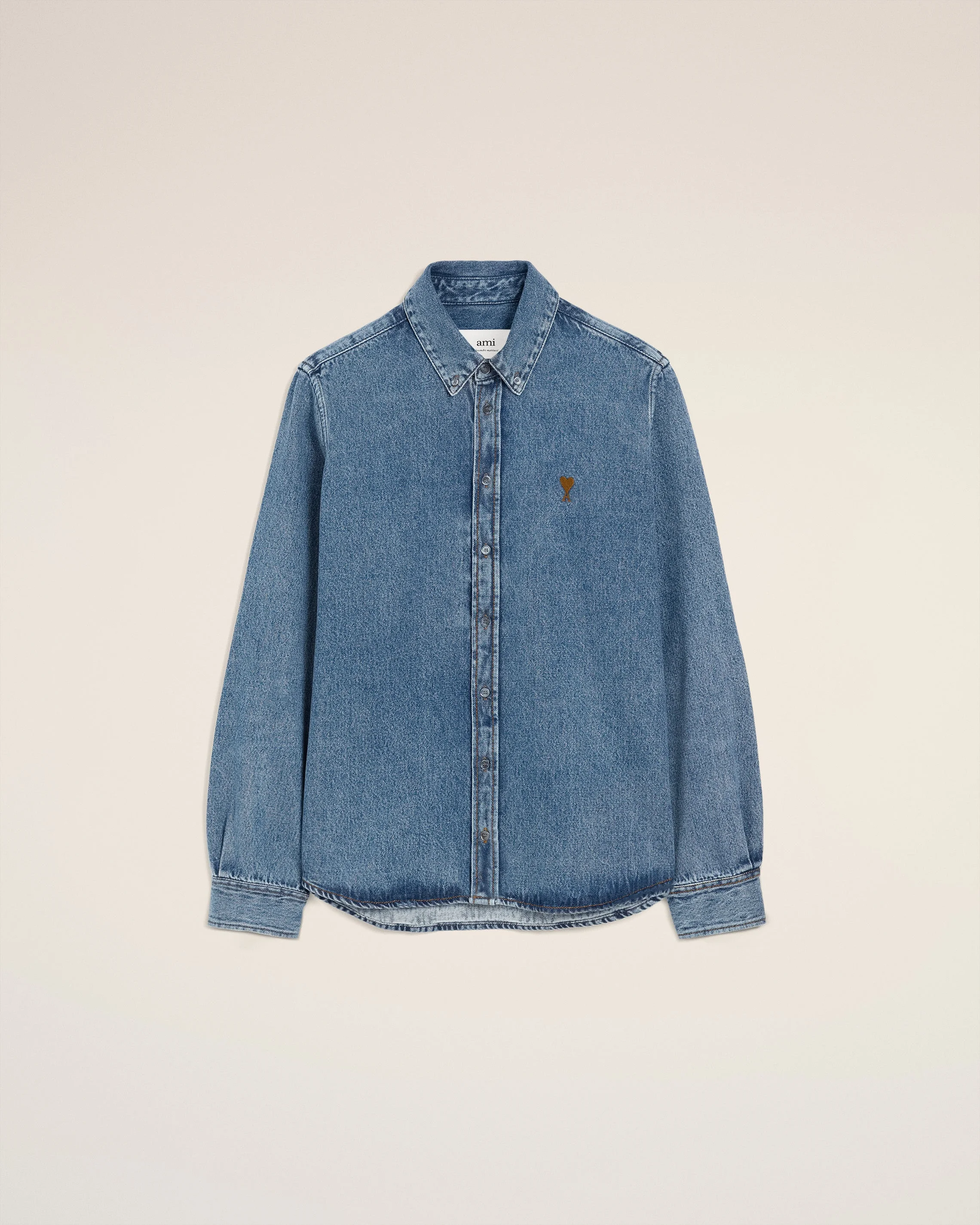 Ami de Coeur button down shirt in used indigo light denim. Unisex product Classic fit Button down collar Buttoned tab on front and cuffs Mother of pearl buttons Ami de Coeur chest embroidery 74 cm center back length (size XS) 75 cm center back length (size M) Made in Portugal (with love) REF: USH786.DE0056.480 SIZE & FIT This style is unisex. For man, take your normal size. For woman, take one size down than your usual size. Man model is 187 cm / 6"2 and is wearing a size M. Woman model is 175 cm / 5"8 and is wearing a size XS. COMPOSITION & CARE GUIDE Main Material : 100% Cotton Machine wash at 30°c Chlorine prohibited Do not tumble dry Medium iron Dry clean possible Wash inside out Wash with similar colours Contains non-textile parts of animal origin
