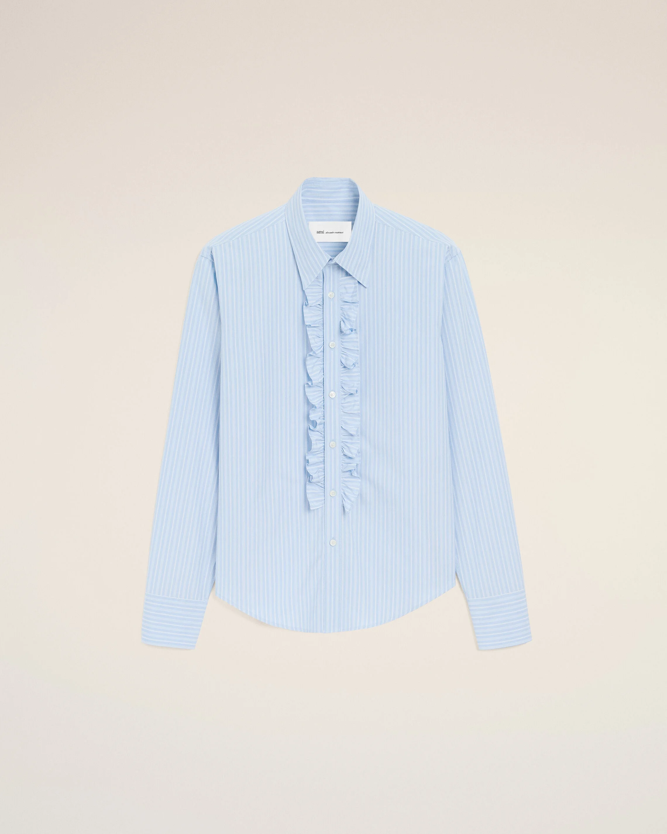 Classic shirt with ruffles in striped cotton poplin. Classic fit Classic collar Ami de coeur plate on the middle back Mother-of-pearl buttons on front placket Cufflinks on cuffs Made in Bulgaria (with love) REF: HSH820.CO0219.4844 SIZE & FIT This item is designed for a close fit. Take your normal size. Man model is 189 cm / 6"2 and is wearing a size 40. COMPOSITION & CARE GUIDE Main Material : 100% Cotton Chlorine Prohibited Do Not Tumble Dry Cool Iron Machine Wash At 30°C Gentle Dry Clean Gentle