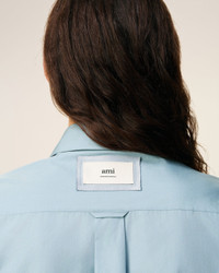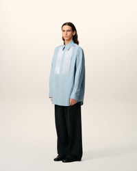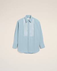 Long sleeves shirt with bi material bib in cotton poplin and satin. Unisex product Oversized fit Classic collar Hidden button placket at the front Buttoned cuffs Mother of pearl buttons Woven label applied to satin raw edge patch at the center back yoke Raw edge finishes Center back length: 90 cm (size M) Made in Madagascar (with love) REF: USH778.CO0063.4506 SIZE & FIT This style is unisex and it's design to be worn oversize. Take your normal size. Man model is 184 cm / 6"0 and is wearing a size M. Woman model is 178 cm / 5"10 and is wearing a size XS. COMPOSITION & CARE GUIDE Main Material : 100% Cotton Secondary Material : 95% Polyester 5% Elastane Collar : 100% Vinyl Polychloride Do not wash Chlorine prohibited Do not tumble dry Cool iron Dry clean gentle