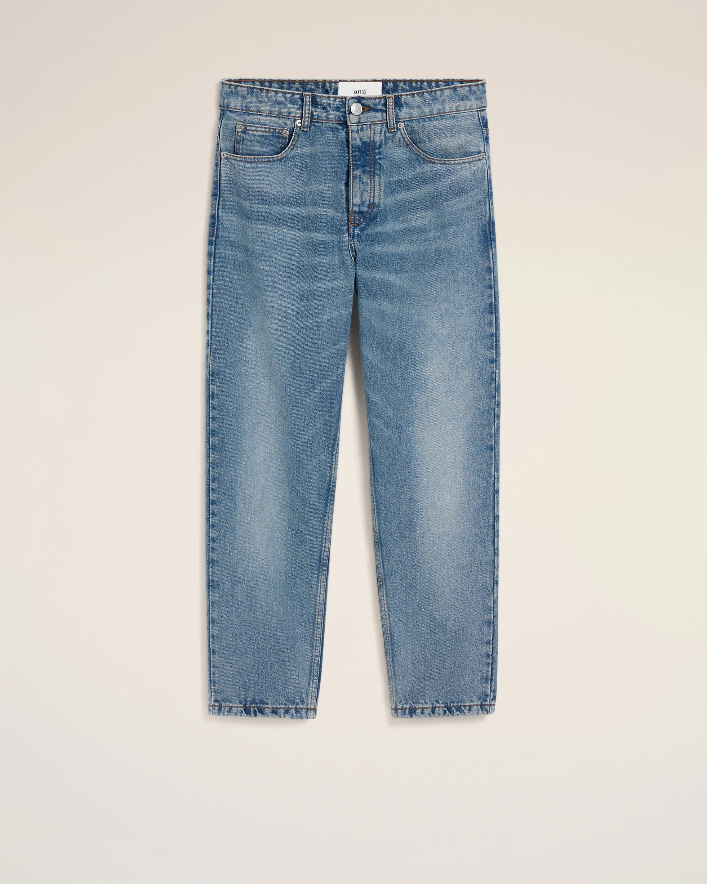 Tapered fit jeans in used indigo denim. Tapered fit 18 cm bottom leg width (size 30) Classic waist Carrot leg Five pockets Buttoned fly Denim metal rivets and buttons in nickel color "ami alexandre mattiussi" patch on the back Tobacco topstitches Made in Portugal (with love) REF: HTR103.DE0046.480 SIZE & FIT Fits true to size. Take your normal size. Model is 1m83 / 6'0" and is wearing a size 30. COMPOSITION & CARE GUIDE 100% Cotton Machine wash at 30°C Chlorine prohibited Do not tumble dry Medium iron Dry clean possible