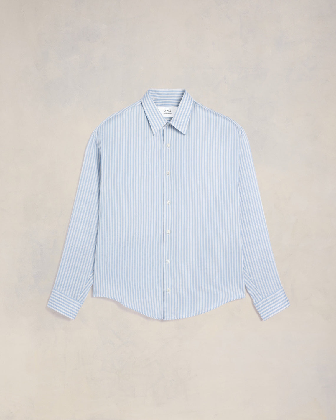 Striped silk and viscose canvas shirt. Boxy fit Unisex product 74 cm center back length (size XS) 77 cm center back length (size M) Tonal Ami de Coeur embroidery under collar Front tab and cuffs buttoned Mother-of-pearl buttons Made in France (with love) REF : USH126.VI0015.195 SIZE & FIT This style is unisex. For man, take your normal size. For woman, take one size down than your usual size. Man model is 1m83 / 6'0" and is wearing a size M. Woman model is 1m78 / 5'10" and is wearing a size XS. COMPOSITION & CARE GUIDE 82% Viscose, 18% Silk Chlorine prohibited Do not tumble dry Dry clean petroleum solvent only on a gentle process Cool iron Do not wash