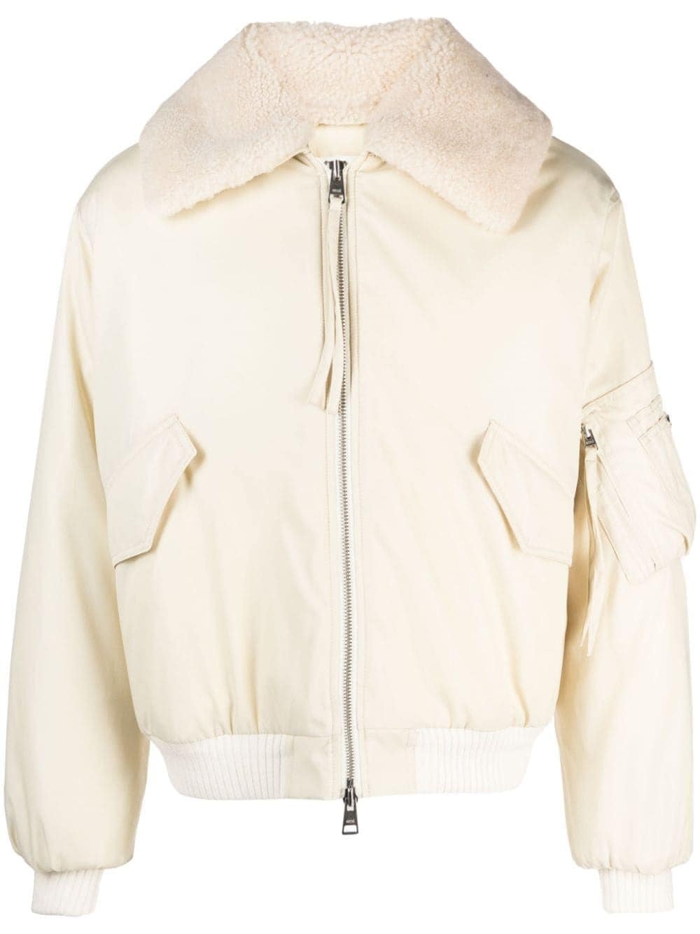 Boxy shearling-collar bomber jacket AMI Paris puts a wintry twist on a utilitarian classic with this white bomber jacket. Made from water-repellent technical twill, it boasts a padded construction and a shearling collar to maximise warmth. Meanwhile, three external pockets allow essentials to be stored and organised. Highlights - Ivory white - Padded design - Detachable shearling collar - Front two-way zip fastening - Long sleeves - Two press-stud fastening side pockets - Internal slip pocket - Ribbed cuffs and hem - Diamond-quilted detailing Imported Composition Polyamide 70%, Cotton 30%