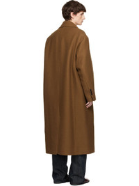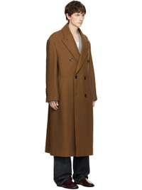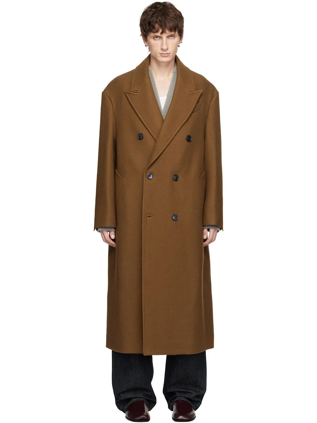 Boiled virgin wool gabardine coat. · Peaked lapel · Double-breasted button closure · Welt pockets at chest and waist · Surgeon's cuffs · Central vent at back hem · Welt pockets at interior · Full twill and satin lining · Logo-engraved horn hardware Supplier color: Noisette Body: 100% virgin wool. Lining 1: 50% cotton, 50% polyester. Lining 2: 54% acetate, 45% viscose, 1% polyester. Lining 3: 65% polyester, 35% cotton. Made in Moldova 252482M176004