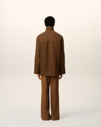 Oversized pea coat with high collar in boiled wool gabardine. Oversized fit Buttoned high collar Horn buttons Single breasted Hidden placket on the front 2 vertical welt pockets 2 bottom flap pockets 3 inside pockets Raw edges finitions on the elbows, cuffs and under collar AMF stitches on the collar, lapel and flap pockets Semi lined 84cm center back length (size 48) Made in Tunisia (with love) REF: HCO456.WV0078.216 SIZE & FIT This item is designed to be worn lose. Take your normal size. Model is 187 cm / 6"2 and is wearing a size 48. COMPOSITION & CARE GUIDE Main Material : 100% New Wool Main Lining : 50% Polyester 50% Cotton Pocket Lining : 65% Polyester 35% Cotton Do not wash Chlorine prohibited Do not tumble dry Cool iron Dry clean gentle