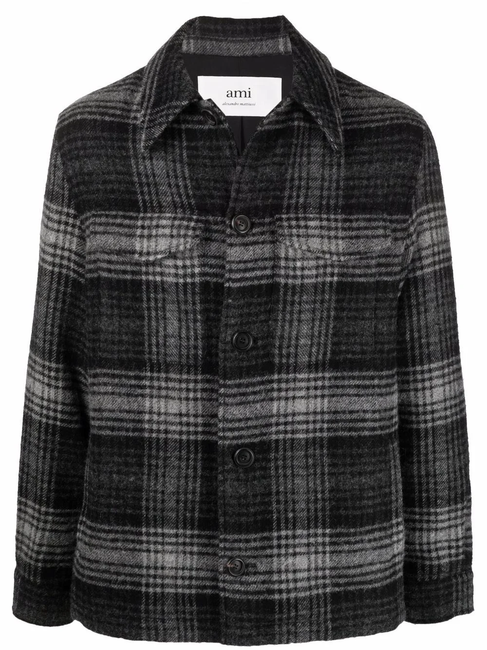 Product Description Grey/black wool checked button-up shirt jacket from AMI Paris featuring check pattern, spread collar, front button fastening, long sleeves, two chest flap pockets and straight hem. Buttoned jacket in check felted wool. - 74 cm back length (size 48) - Fully lined - Patch pockets with flap and hidden snap buttons - Side welt pockets - Buttoned cuffs - ami engraved black horn buttons REF HJK211.280057 Size & Fit Fits true to size. Take your normal size. Materials & Care Instructions DO NOT WASH, DO NOT BLEACH, DO NOT TUMBLE DRY, COOL IRON, DRY CLEAN GENTLE