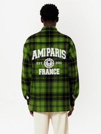 logo-print plaid-patterned shirt AMI Paris cuts a relaxed silhouette in this green and black plaid patterned shirt, evident in its comforting wool blend construction and casual varsity-style logo print to the rear. Highlights - Green - Black - Wool blend - Logo print to the rear - Plaid check pattern - Classic collar - Front button fastening - Chest patch pocket - Long sleeves - Buttoned cuffs - Straight hem - When buying this unisex item, keep in mind that it is graded in standard men's sizing. Imported Composition Wool 45%, Cotton 37%, Polyamide 15%, Other fibres 3% Washing instructions Read Manufacturer Guidelines