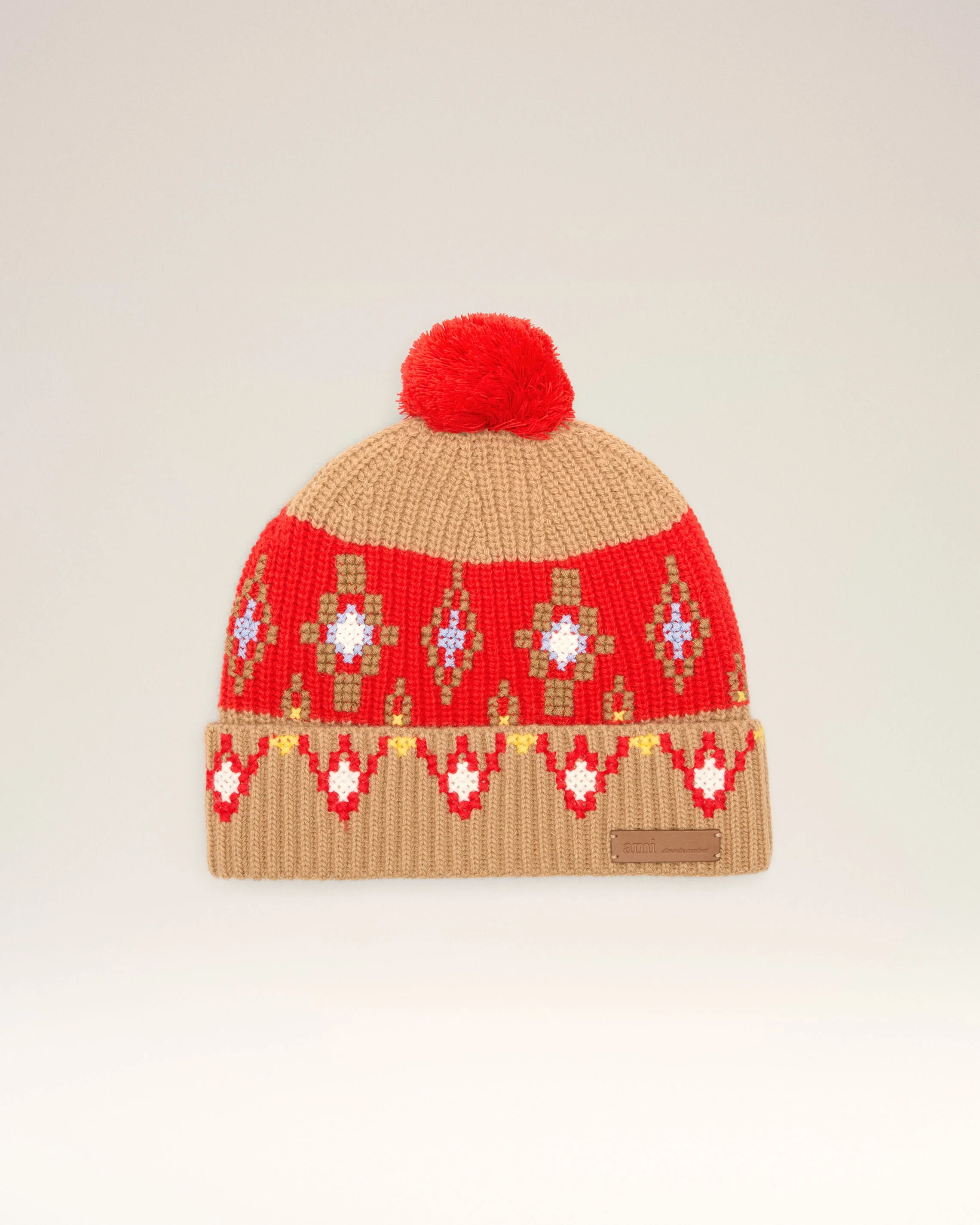Beanie in wool knit. Limited Edition - Ami Holidays Capsule Unisex product Half cardigan rib stitch Cross stitch embroidery all over "ami" embossed leather label Made in Italy (with love) REF: UBO007.KN0137.2801 SIZE & FIT One size. COMPOSITION & CARE GUIDE Main Material : 100% Wool Chlorine prohibited Do not tumble dry Dry flat Dry clean gentle Cool iron Hand wash low temperature Wash with similar colours