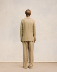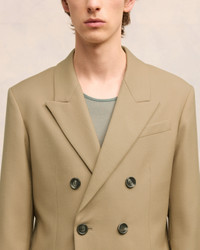 Double breasted jacket in soft wool gabardine. Regular fit 77 cm center back length (size 48) Lined Double breasted Peak collar Welt chest pocket Flap pockets Inside pockets Double slits on the back Bottom sleeves buttoned Horn buttons Made in Romania (with love) REF : HBV217.WV0026.255 SIZE & FIT Fits true to size. Take your normal size. Model is 1m87 / 6'2" and is wearing a size 48. COMPOSITION & CARE GUIDE 100% New Wool Do not wash Chlorine prohibited Do not tumble dry Cool iron Dry clean petroleum solvent only on a gentle process