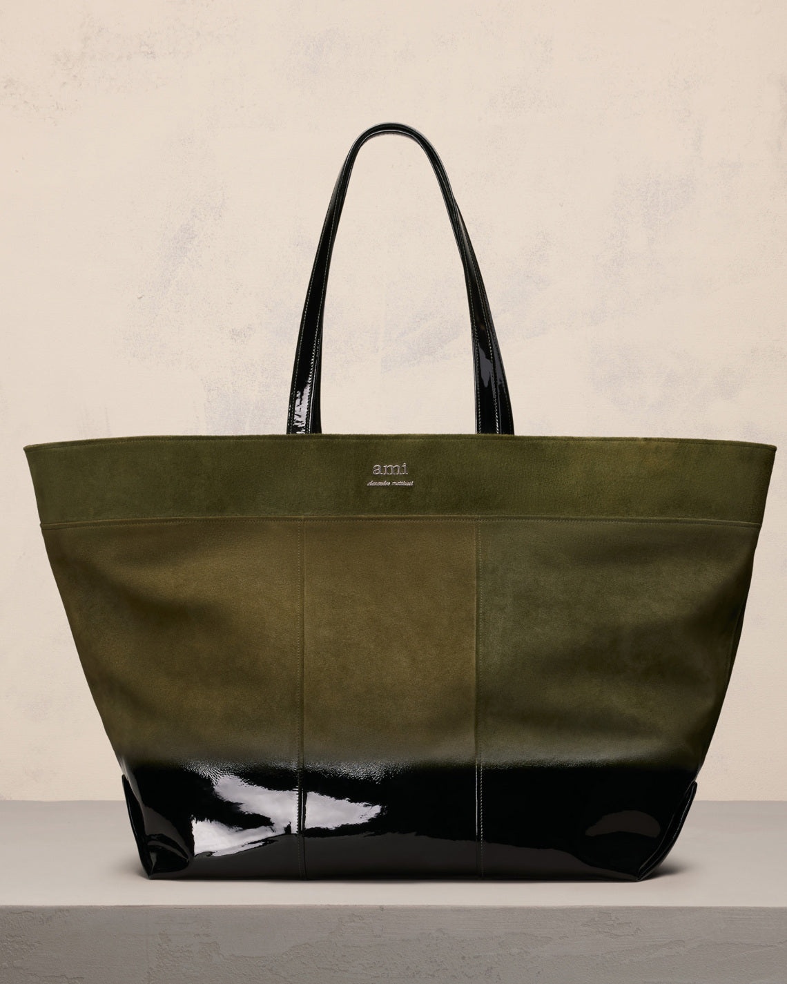 Maxi East West Shopping bag in gradient patent and suede leather. Linen canvas lining ami alexandre mattiussi lettering in metal Inside zipped flying pocket Patent leather handles, shoulder carry Metal hardware in vibrated silver color Size: 45x45x22.5 cm, length at the top 78 cm Made in Morocco (with love) REF : ULL505.AL0060.364 SIZE & FIT One size. COMPOSITION & CARE GUIDE 100% Calfskin Our leathergoods are made from delicate materials. To keep the original aspect of the leather as long as possible, please avoid contact with abrasive and oily substances. Make sure not to expose them at the direct light for too long and to wipe them with a soft and dry cloth when wet. To avoid deformations, insure to not overload them. Keep them in their dust bag and safe from humidity.