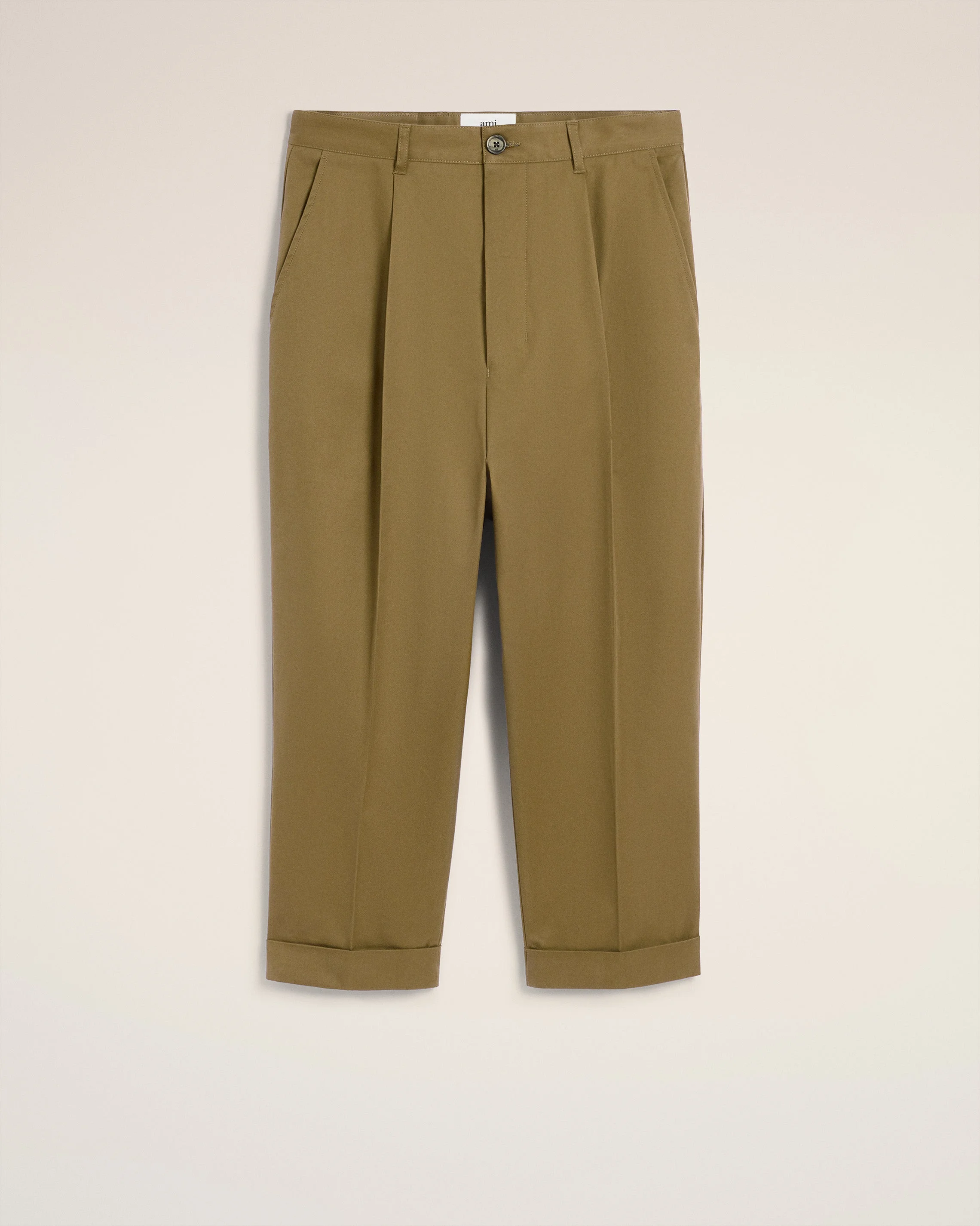 Carrot oversized fit trousers in cotton gabardine. Oversized carrot fit Buttoned fly Horn buttons "ami alexandre mattiussi" patch on the back Front pleats Cuffed hems 21 cm bottom leg width (size M) Made in Portugal (with love) REF: HTR121.CO0132.298 SIZE & FIT Fits true to size. Take your normal size. Model is 185 cm / 6"1 and is wearing a size M. COMPOSITION & CARE GUIDE Pocket Lining : 65% Polyester 35% Cotton Main Material : 100% Cotton Machine wash at 30°c gentle Chlorine prohibited Do not tumble dry Cool iron Dry clean possible Contains non-textile parts of animal origin
