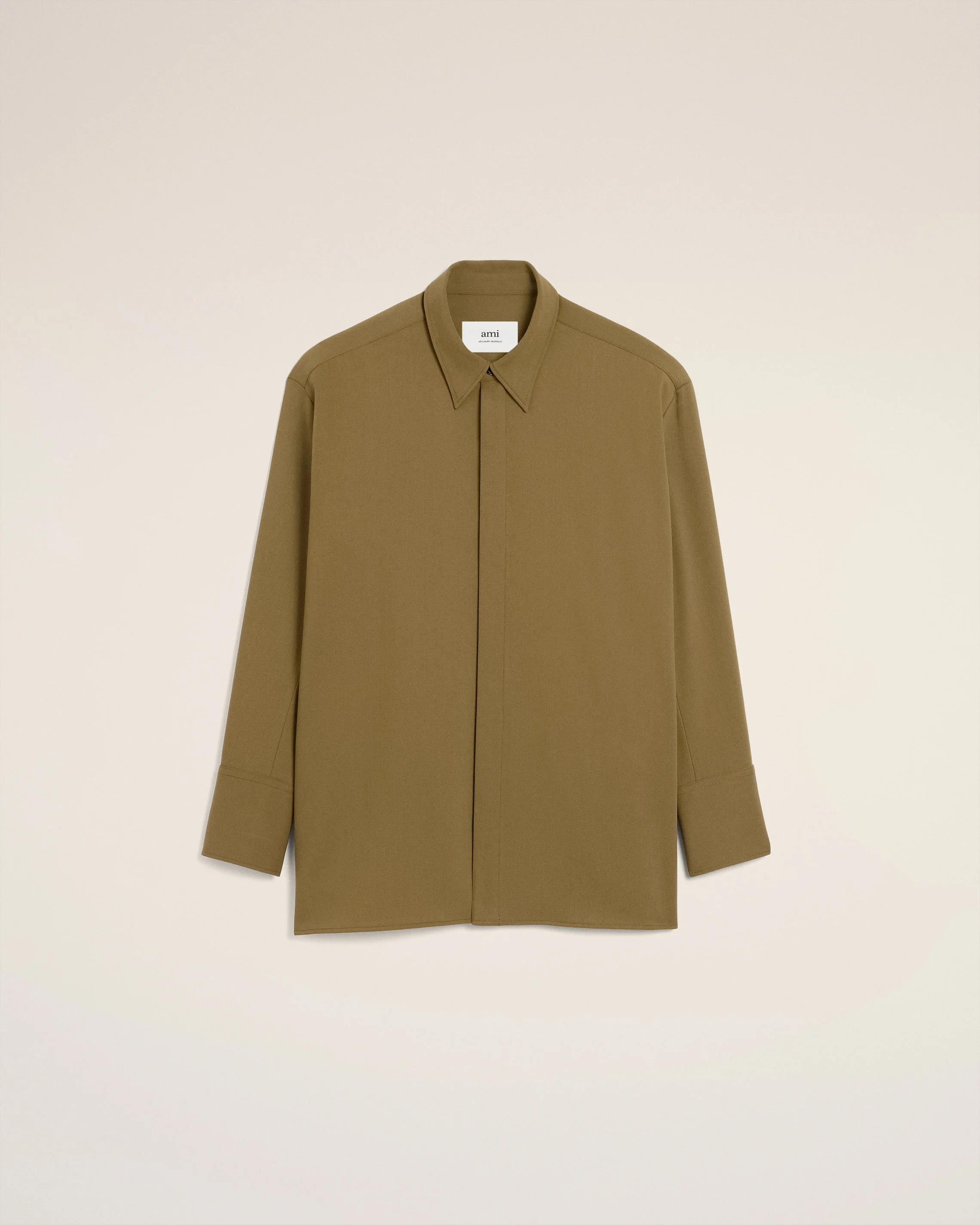 Loose shirt in wool tricotine. Large fit Classic collar Hidden buttoned placket Horn buttons Buttoned cuffs Silver metal placket Ami de Coeur at the middle back Side slits at the bottom Center back length 86 cm (size 40) Made in Portugal (with love) REF: HSH782.WV0067.298 SIZE & FIT This item is designed to be worn lose. Take your normal size. Model is 185 cm / 6"1 and is wearing a size 40. COMPOSITION & CARE GUIDE Main Material : 100% New Wool Chlorine prohibited Do not tumble dry Do not wash Medium iron Dry clean gentle