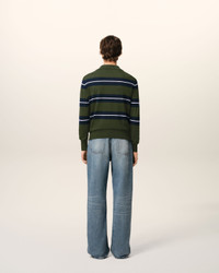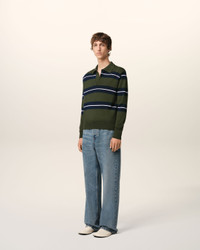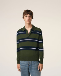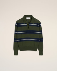 Polo in striped extrafine wool silk. Jersey stitch Tonal Ami de Coeur embroidery on body bottom 64 cm center back length (size M) Made in Italy (with love) REF: HPL376.KN0079.3765 SIZE & FIT Fits true to size. Take your normal size. Model is 1m86 / 6'1" and is wearing a size M. COMPOSITION & CARE GUIDE 75% Wool, 25% Silk Hand wash low temperature Chlorine prohibited Do not tumble dry Cool iron Dry flat Dry clean possible