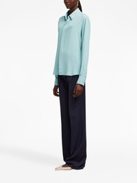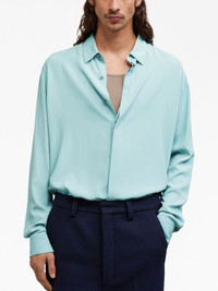 button-up crepe shirt Classic tailoring in a solid wash of colour, this AMI Paris shirt is crafted in lightweight crepe to enhance its drape and dyed in a vibrant shade of aqua blue. Highlights - Aqua blue - Crepe texture - Classic collar - Concealed front button fastening - Long sleeves - Buttoned cuffs - Rear curved hem - When buying this unisex item, keep in mind that it is graded in standard men's sizing. Imported Composition Acetate 55%, Silk 45% Washing instructions Read Manufacturer Guidelines