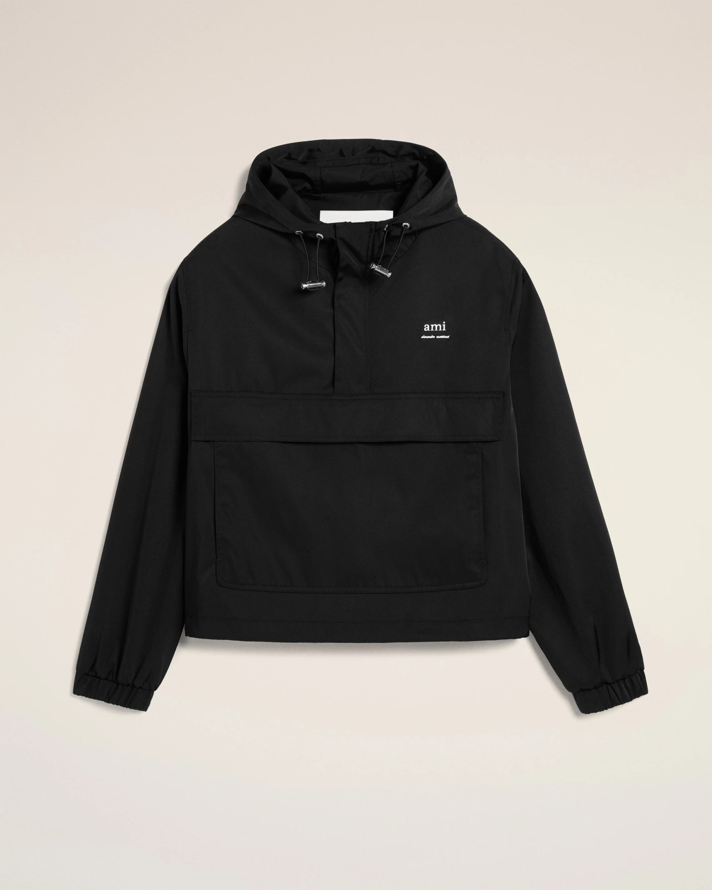 Hooded windbreaker in water-repellent technical twill in nylon and cotton . Unisex product 60 cm center back length (size XS) 62,5 cm center back length (size M) Water-repellent fabric Nickel simple metal zipper with "ami" engraved pullers Front zip tab with invisible nickel press snap buttons Front kangourou pocket Waist and hood with adjustable drawstring "ami alexandre mattiussi" metal lettering signature on the chest Metal stoppers and eyelets in nickel color Made in Romania (with love) REF : UJK101.PA0007.001 SIZE & FIT This style is unisex. For man, take your normal size. For woman, take one size down than your usual size. COMPOSITION & CARE GUIDE 70% Polyamide, 30% Cotton Do not wash Chlorine prohibited Do not tumble dry Cool iron Dry clean petroleum solvent only on a gentle process