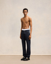 Classic fit jeans in raw indigo denim. Classic fit 19 cm bottom leg width (size 30) Classic waist Fitted leg 5 pockets Buttoned fly Metal studs and buttons in nickel color "ami alexandre mattiussi" patch on the back Tobacco topstitches Made in Portugal (with love) REF : HTR001.DE0011.402 SIZE & FIT Fits true to size. Take your normal size. Model is 1m87 / 6'2" and is wearing a size 30. COMPOSITION & CARE GUIDE 100% Cotton Machine wash at 30°C Chlorine prohibited Do not tumble dry Line dry in shade Cool iron Do not dry clean Wash and iron inside out
