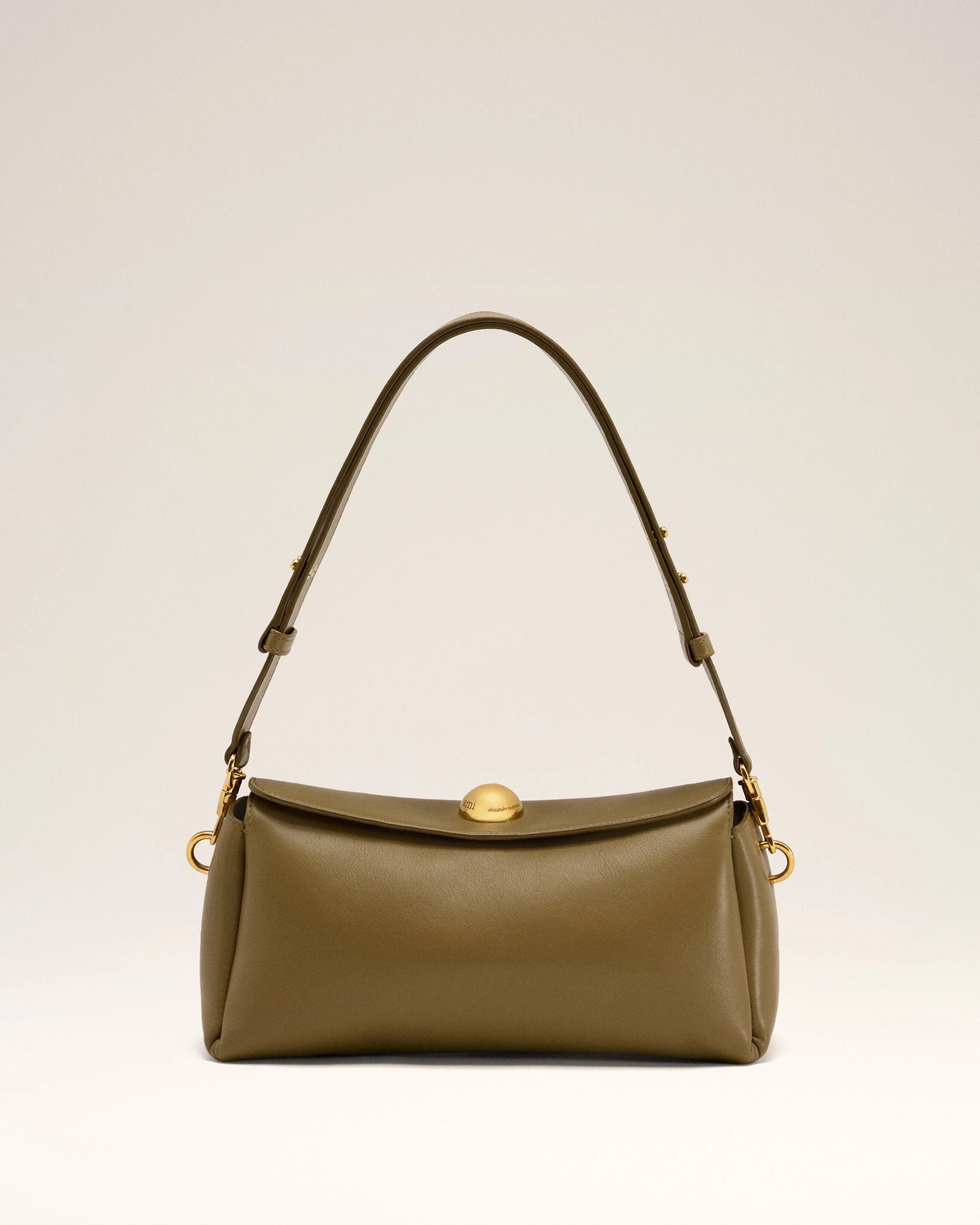 Carrousel bag in smooth leather. Suede leather lining Domed metal stud with engraved "ami alexandre mattiussi" logo One main compartment with an inside patched pocket Adjustable leather strap, crossbody or shoulder carry Magnetic flap closure Metal hardware in vibrated brass color Size: 26x12x10.5 cm Made in Spain (with love) REF: ULL027.AL0103.350 SIZE & FIT Size: 26x12x10.5 cm COMPOSITION & CARE GUIDE 100% Calfskin Our leathergoods are made from delicate materials. To keep the original aspect of the leather as long as possible, please avoid contact with abrasive and oily substances. Make sure not to expose them at the direct light for too long and to wipe them with a soft and dry cloth when wet. To avoid deformations, insure to not overload them. Keep them in their dust bag and safe from humidity.