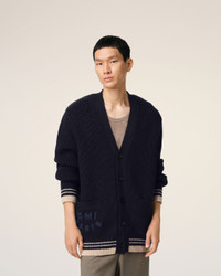 Cardigan in college ribs wool. Unisex product Half english ribs stitch "AMI Paris" knitted patch embroidered under right pocket Ami de Coeur knitted patch embroidered on the back under collar 73 cm center back length (size M) 59 cm center back length (size XS) Made in Portugal (with love) REF: UKC168.KN0068.4011 SIZE & FIT This style is unisex and it's design to be worn oversize. Take your normal size. Man model is 1m86 / 6'1" and is wearing a size M. Woman model is 1m80 / 5'11" and is wearing a size XS. COMPOSITION & CARE GUIDE 100% New Wool Hand wash low temperature Chlorine prohibited Do not tumble dry Dry flat Cool iron Dry clean possible