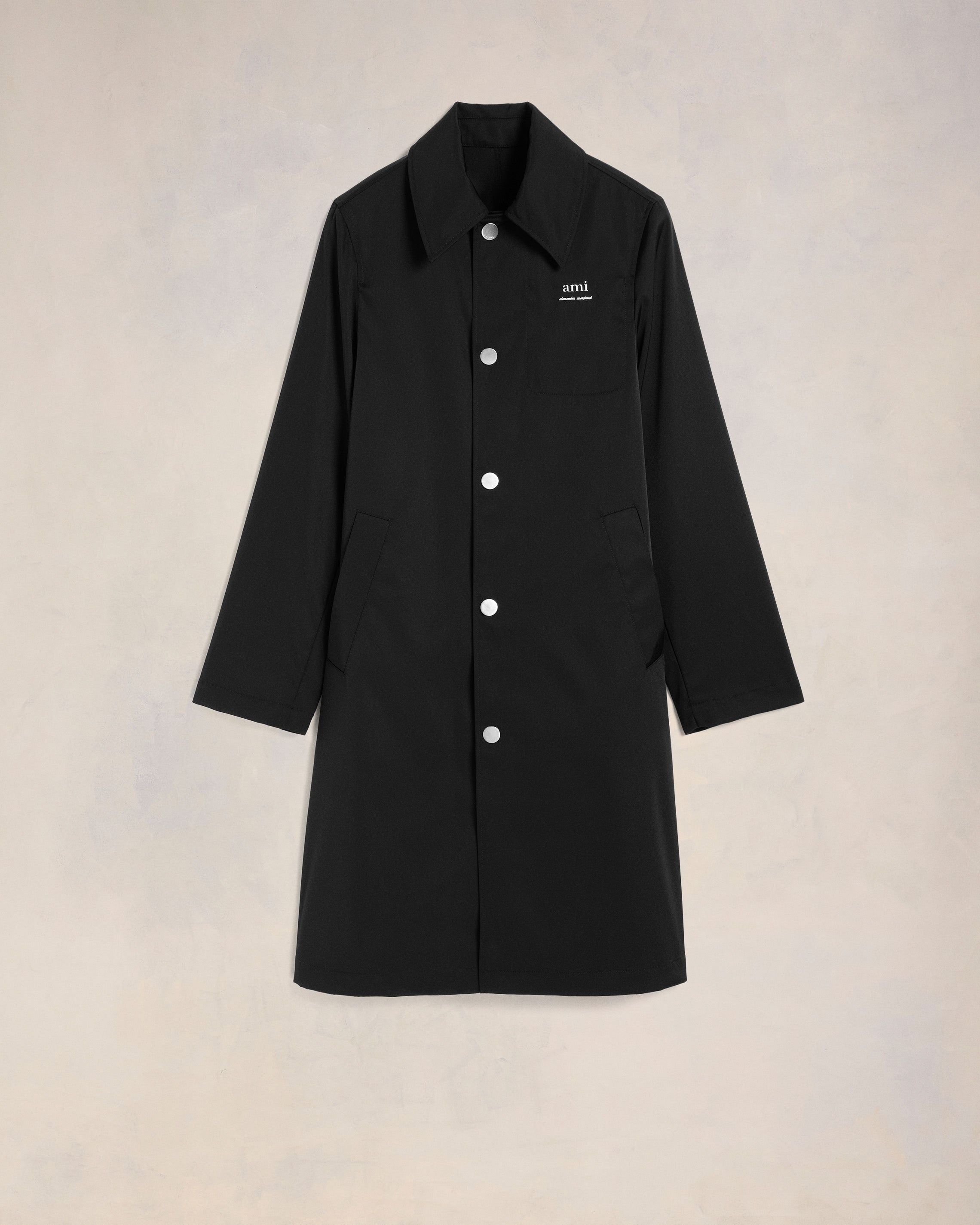 Raincoat in technical twill in nylon and cotton. Unisex product 105 cm center back length (size XS) 107,5 cm center back length (size M) Water-repellent fabric Front closing with snap buttons in nickel color First snap button in nickel color on the collar with "ami" banding Front pockets with invisible snap buttons "ami alexandre mattiussi" metal lettering signature on the chest Made in Romania (with love) REF : UJK542.PA0007.001 SIZE & FIT This style is unisex. For man, take your normal size. For woman, take one size down than your usual size. Man model is 1m83 / 6'0" and is wearing a size M. Woman model is 1m78 / 5'10" and is wearing a size XS. COMPOSITION & CARE GUIDE 70% Polyamide, 30% Cotton Do not wash Chlorine prohibited Do not tumble dry Cool iron Dry clean petroleum solvent only on a gentle process