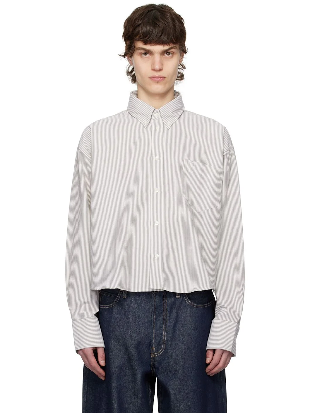 Oversized cotton oxford cloth shirt. Stripes throughout. · Button-down spread collar · Button closure · Logo embossed at patch pocket · Cropped shirttail hem · Dropped shoulders · Pleated single-button barrel cuffs · Mother-of-pearl hardware Supplier color: Loden/White cream 100% cotton. Made in Portugal 251482M192006