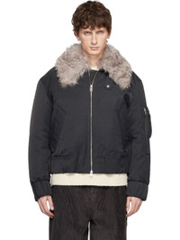 Padded crinkled nylon serge bomber jacket. · Water-repellent · Detachable shearling trim at spread collar · Press-stud tab at collar · Two-way zip closure · Welt pockets at waist · Elasticized hem and cuffs · Utility pocket with logo patch at sleeve · Patch pocket and welt pockets at interior · Full taffeta and satin lining · Logo-engraved silver-toned hardware Supplier color: Anthracite Body: 100% polyamide. Trim: 100% lambskin. Fill: 100% polyester. Lining 1: 100% polyester. Lining 2: 100% cotton. Made in Romania 252482M175001