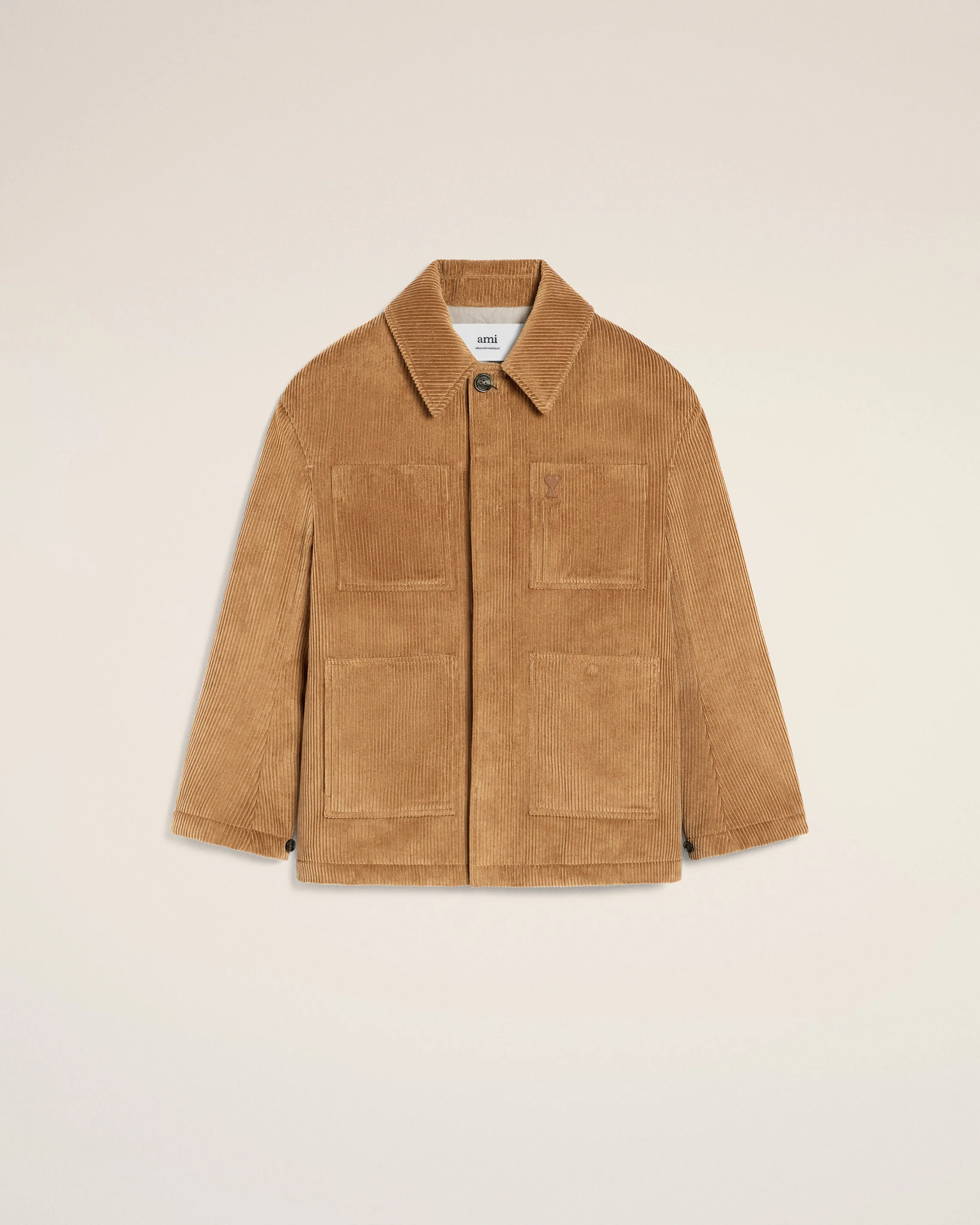 Padded worker jackets in corduroy velvet. Limited Edition - Ami Holidays Capsule Unisex product Corduroy velvet Patch pockets Buttoned cuffs "ami" engraved buttons Chest ami de Coeur leather patch Fully lined and padded 80 cm center back length (size M) 78 cm center back length (size XS) Made in Romania (with love) REF: UJK852.CO0131.280 SIZE & FIT This style is unisex and it's design to be worn oversize. Take your normal size. Woman model is 178 cm / 5"9 and is wearing a size XS. Man model is 182 cm / 5"9 and is wearing a size M. COMPOSITION & CARE GUIDE Main Material : 100% Cotton Main Lining : 50% Polyester 50% Cotton Padding : 100% Polyester Pocket Lining : 100% Cotton Chlorine prohibited Do not tumble dry Dry clean possible Cool iron Contains non-textile parts of animal origin Do not wash