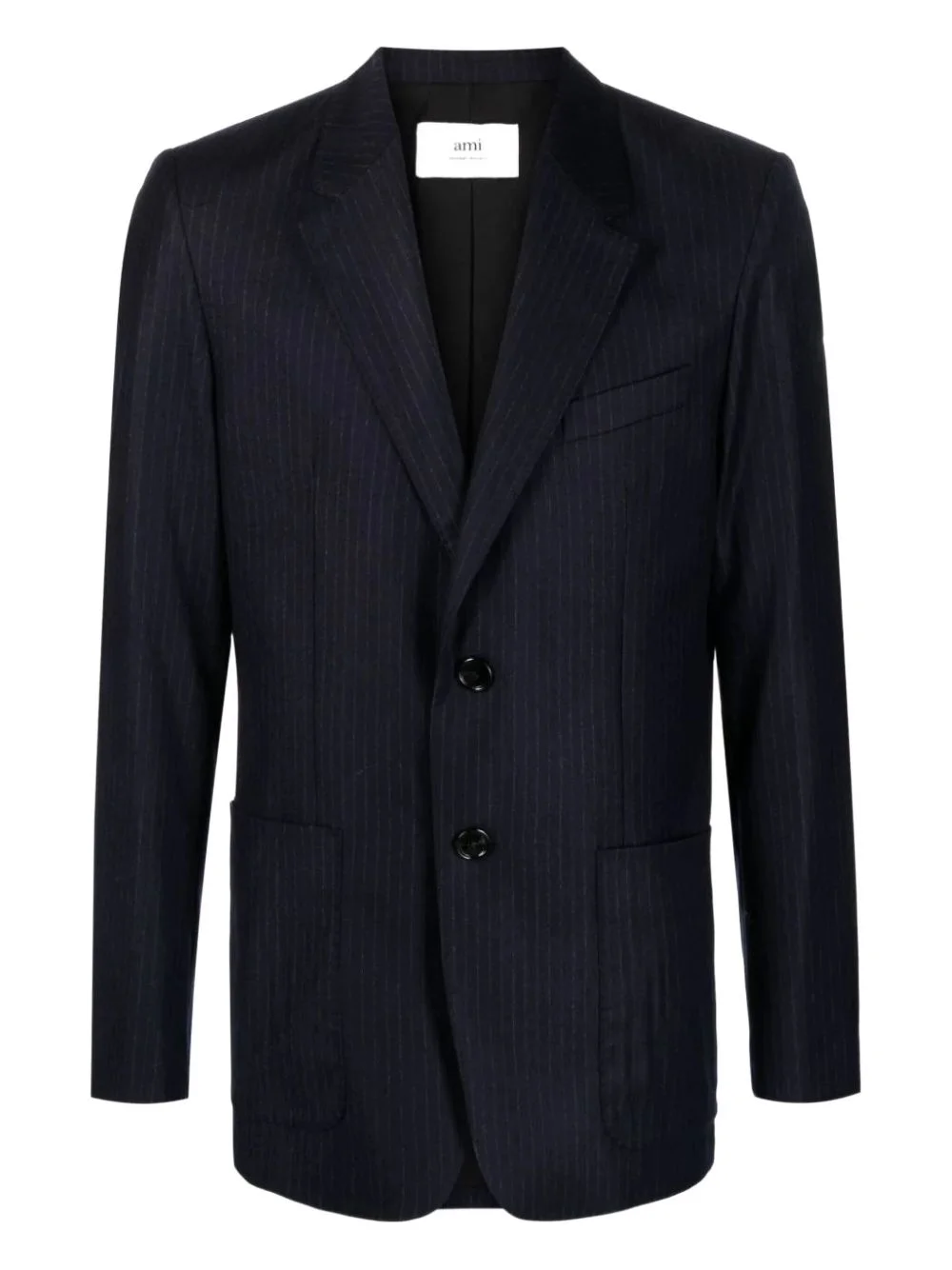 pinstriped single-breasted blazer Crafted from virgin wool, this AMI Paris blazer is adorned with a classic pinstripe pattern. Designed in a single-breasted silhouette, it features peak lapels and two patch pockets on the front. Highlights - Midnight blue/ivory white - Virgin wool - Pinstripe pattern - Peak lapels - Shoulder pads - Long sleeves - Buttoned cuffs - Chest welt pocket - Two front patch pockets - American rear vent - Straight hem Imported Composition Wool 100% Washing instructions Dry Clean Only