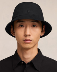 Reversible bucket hat in nylon and cotton technical twill and cotton gabardine. Tonal Ami de Coeur studs ami alexandre mattiussi embroidery Water-repellent fabric Made in Italy (with love) REF : UHA240.PA0007.001 SIZE & FIT Fits true to size. Take your normal size. COMPOSITION & CARE GUIDE 70% Polyamide, 30% Cotton Clean with a cloth or brush.