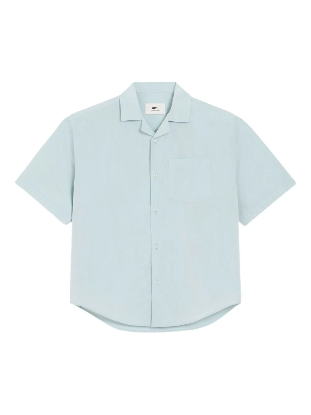 short-sleeve button-up shirt Highlights - Blue - Button fastening - Open collar - Chest patch pocket - Mother of pearl buttons Imported Composition Polyester 100% Washing instructions Machine Wash