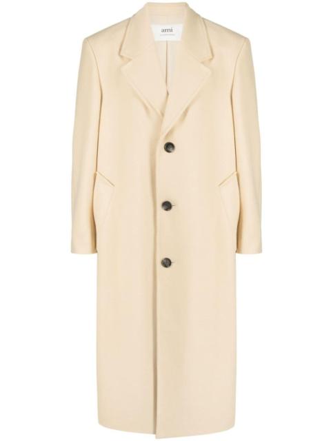single-breasted virgin wool coat Spun from a virgin wool blend, this AMI Paris coat is tailored to a classic single-breasted silhouette. It's finished with notched lapels and inset pockets. Highlights - Navy blue - Virgin wool blend - Notched lapels - Front button fastening - Long sleeves - Buttoned cuffs - Two side inset pockets - Straight hem Imported Composition Wool 90%, Polyamide 10%