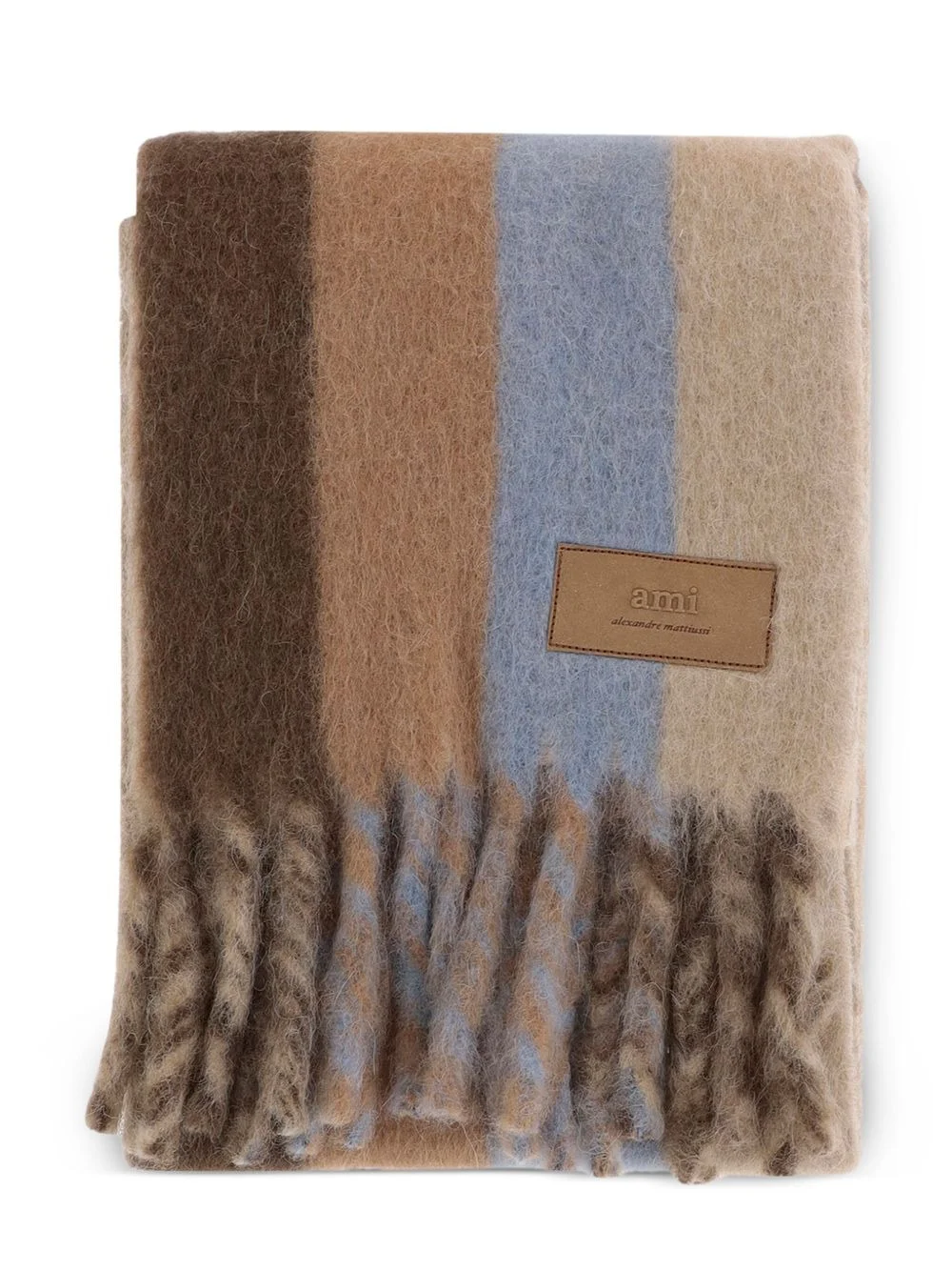 striped fringed scarf Highlights - Brown - Vertical stripe pattern - Fringed edge - Logo patch to the side Made in Italy Composition Wool 35%, Alpaca Wool 22%, Mohair 22%, Nylon 21% SIZE & FIT Measurement LENGTH 94.48 in(240 cm) WIDTH 9.44 in(24 cm)