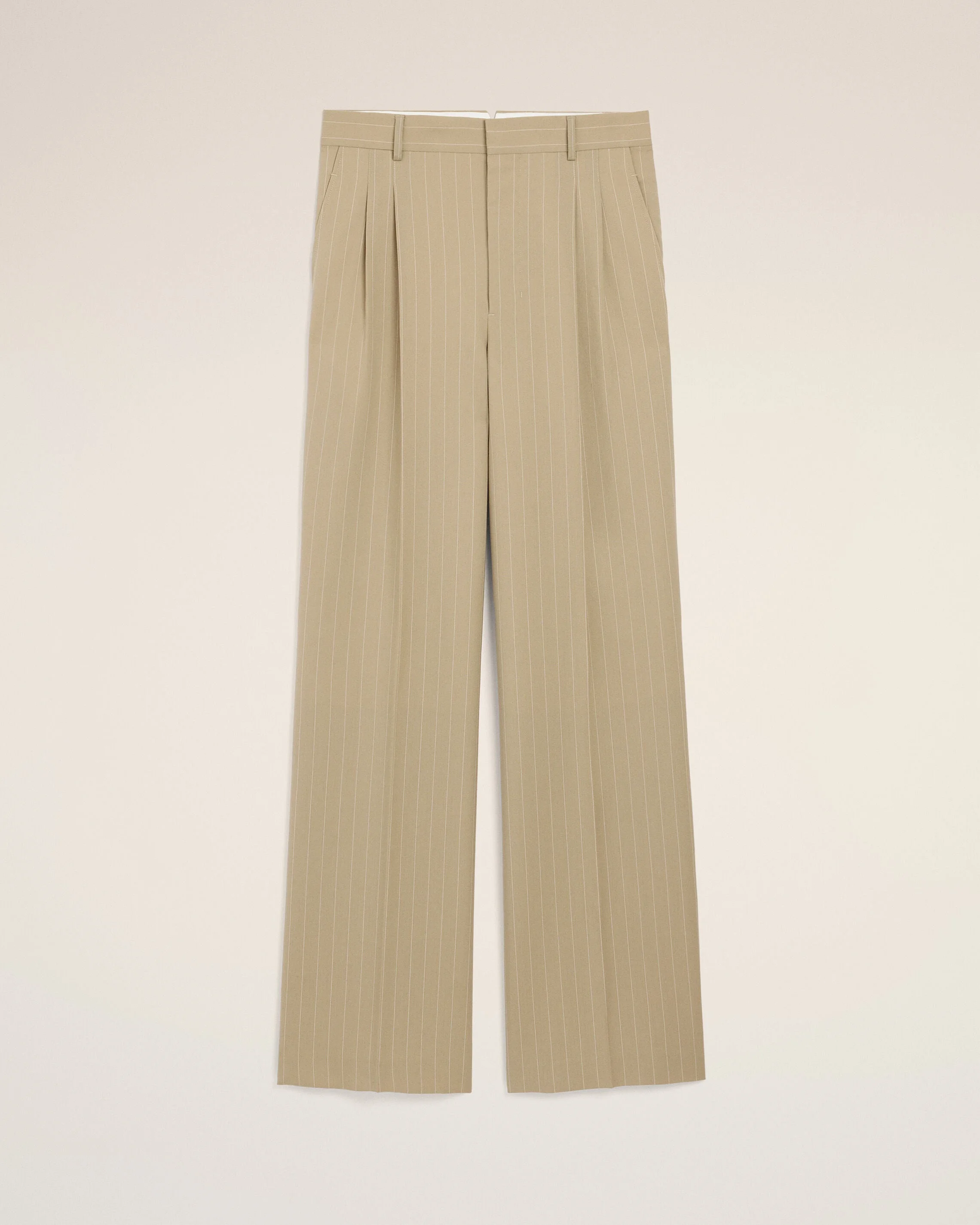 Low waist two pleats wide trousers in striped wool gabardine. Wide fit Low waist Front lining to knees Front pleats Buttoned front fly Ami waistband Belt with loops V detail on the back Buttoned back pockets Horn buttons Made in Romania (with love) REF: HTR860.WV0197.A043 SIZE & FIT This item is designed to be worn lose. Take your normal size. Man model is 189 cm / 6"2 and is wearing a size 40. COMPOSITION & CARE GUIDE Main Material : 100% New Wool Main Lining : 100% Polyester Pocket Lining : 65% Polyester, 35% Cotton Do Not Wash Chlorine Prohibited Do Not Tumble Dry Cool Iron Dry Clean Gentle