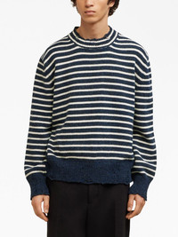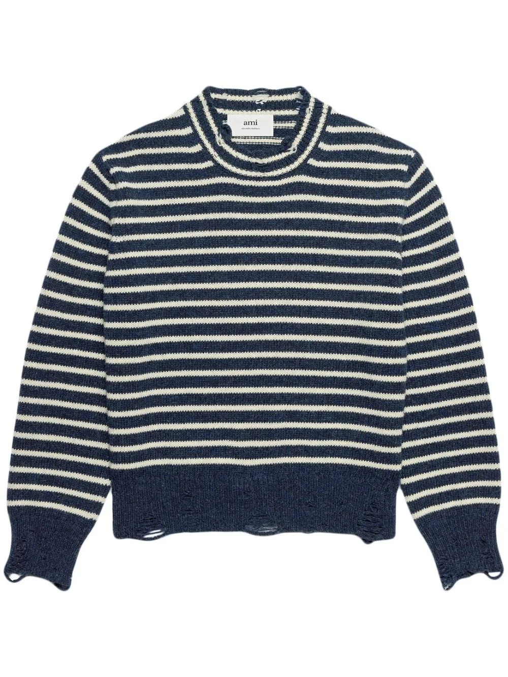 striped ribbed crew neck jumper Rendered in a deep navy hue, this crew neck jumper from AMI Paris boasts a nautical-inspired design thanks to its horizontal stripe pattern throughout. It is spun in Portugal from delicate wool whilst ripped detailing adds a distressed appeal to its relaxed silhouette. Highlights - Navy blue/white - Wool - Chunky knit - Horizontal stripe pattern - Crew neck - Drop shoulder - Ripped detailing - Ribbed cuffs and hem - When buying this unisex item, keep in mind that it is graded in standard men's sizing. Imported Composition Wool 100% Washing instructions Read Manufacturer Guidelines