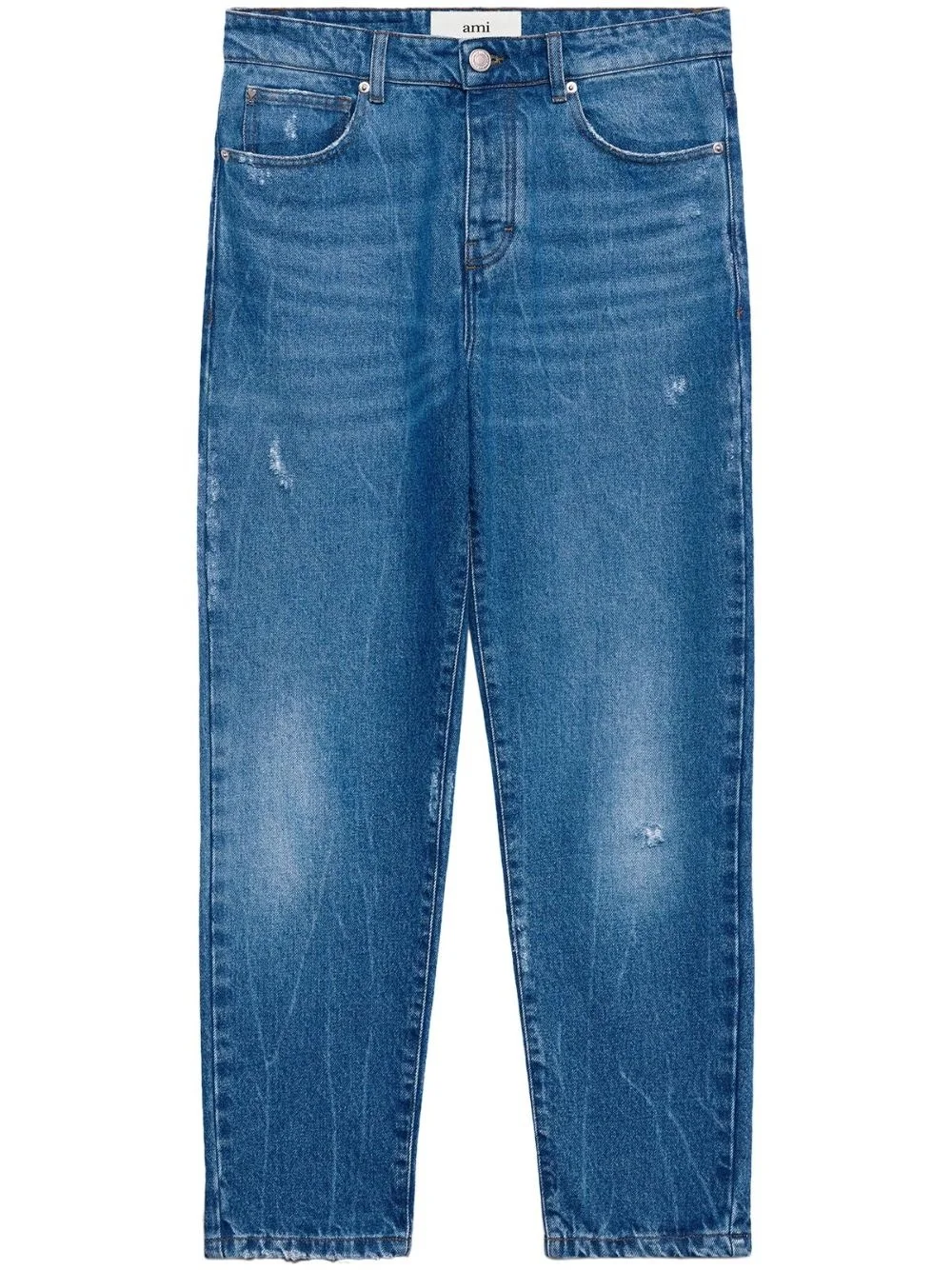 logo-patch straight-leg jeans AMI Paris' logo highlights these blue straight-leg jeans from the brand's AW23 collection - appearing on the back, in light brown. This model is crafted from cotton and features a mid-washed effect and ripped details throughout. Highlights - Blue - Cotton - Logo patch to the rear - Ripped detailing - Belt loops - Front button fastening - Classic five pockets - Straight leg Imported Composition Cotton 100%